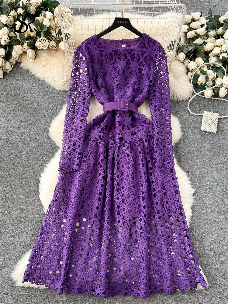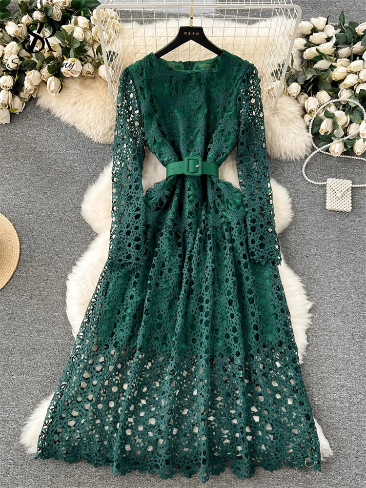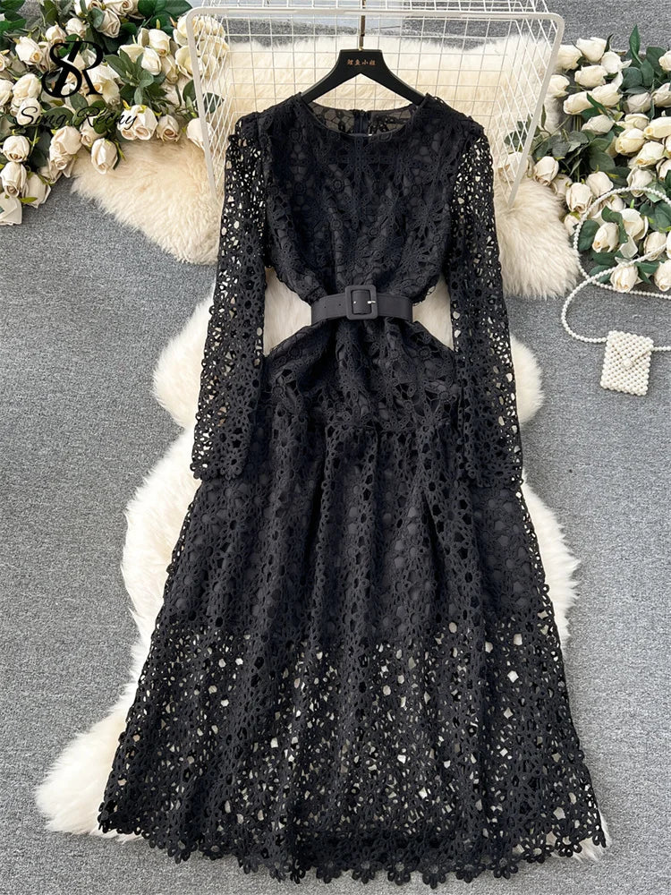 Runhufu Senior Lace Long Dress 2024 New Style Hollow out Design Fashion Women O Neck Long Sleeve Slim Belt A-Line Party Dress