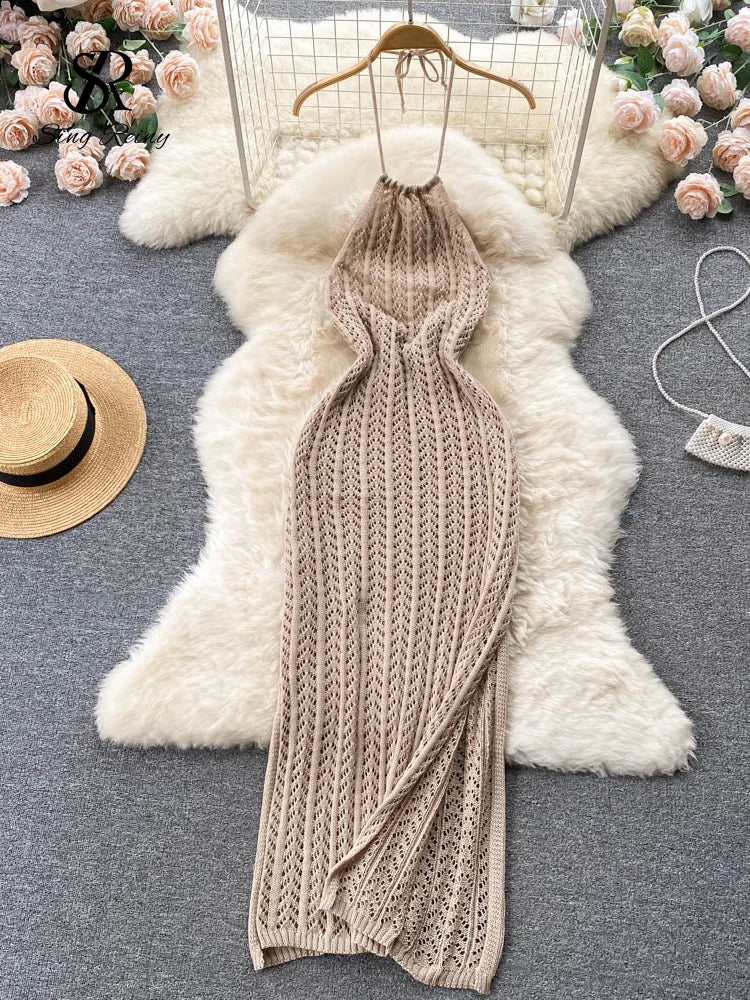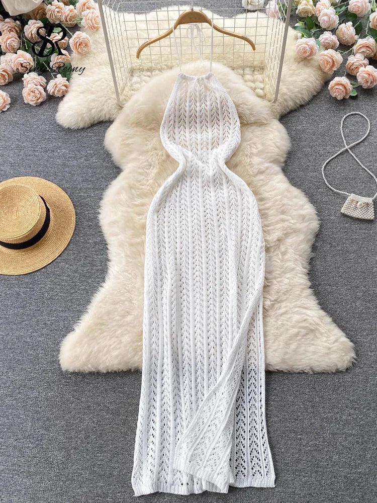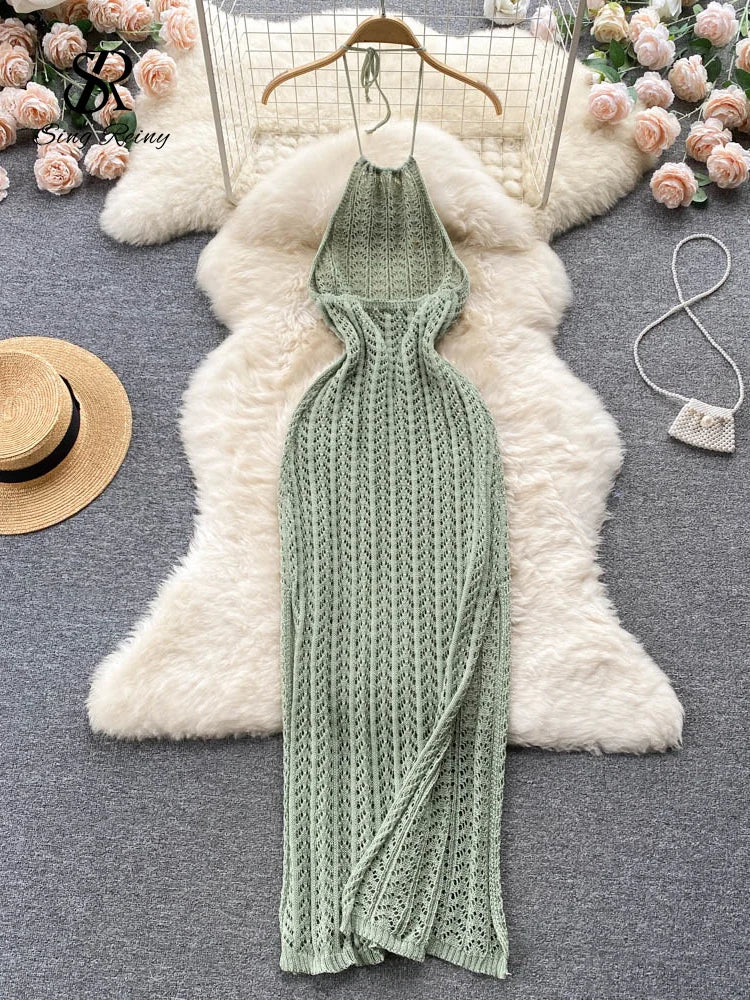 Runhufu Sexy Backless Knitted Dress Women Halter Sleeveless Hollow Out Split Sundress Korean Vacation Knit Beach Long Dress