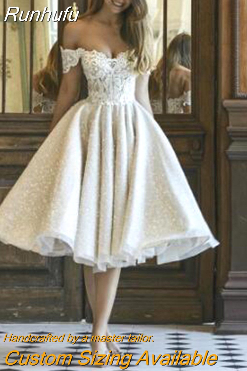 Runhufu Short Glitter Wedding Dresses Tea-Length Off Shoulder Elegant Women Bridel Gowns Lace Applique Shiny Princess Wedding
