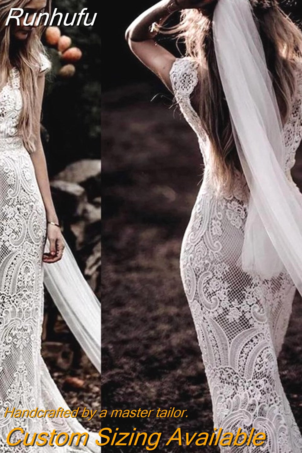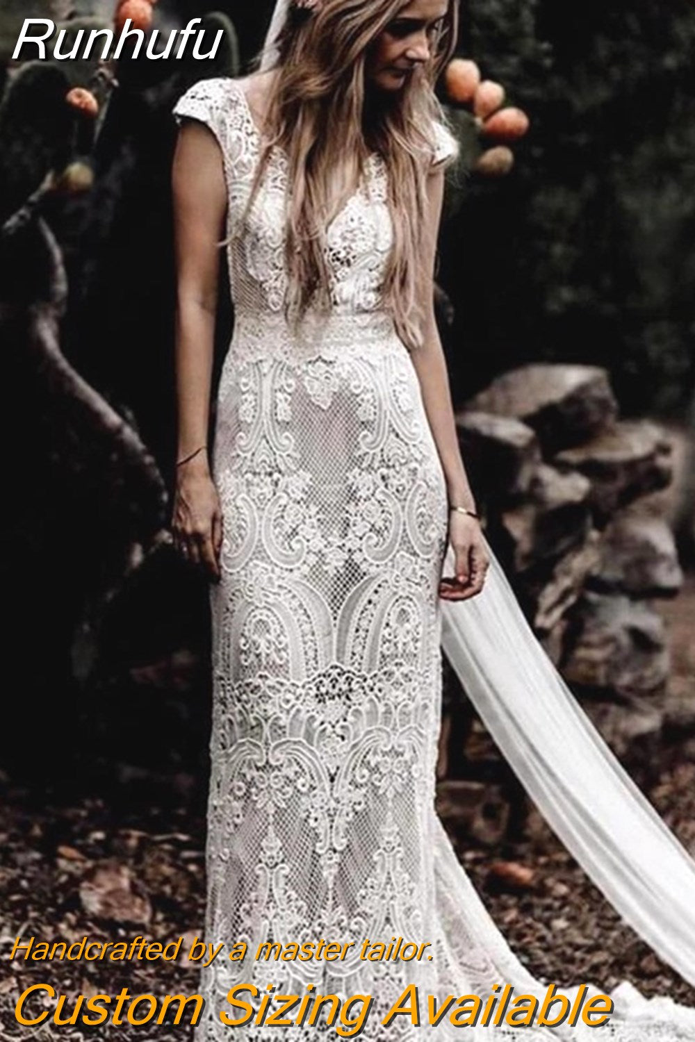 Runhufu Short Sleeve Lace Sheath Boho Mermaid Wedding Dress V Neck Bohemian Wedding Bride Dress Real Photo Custom Made
