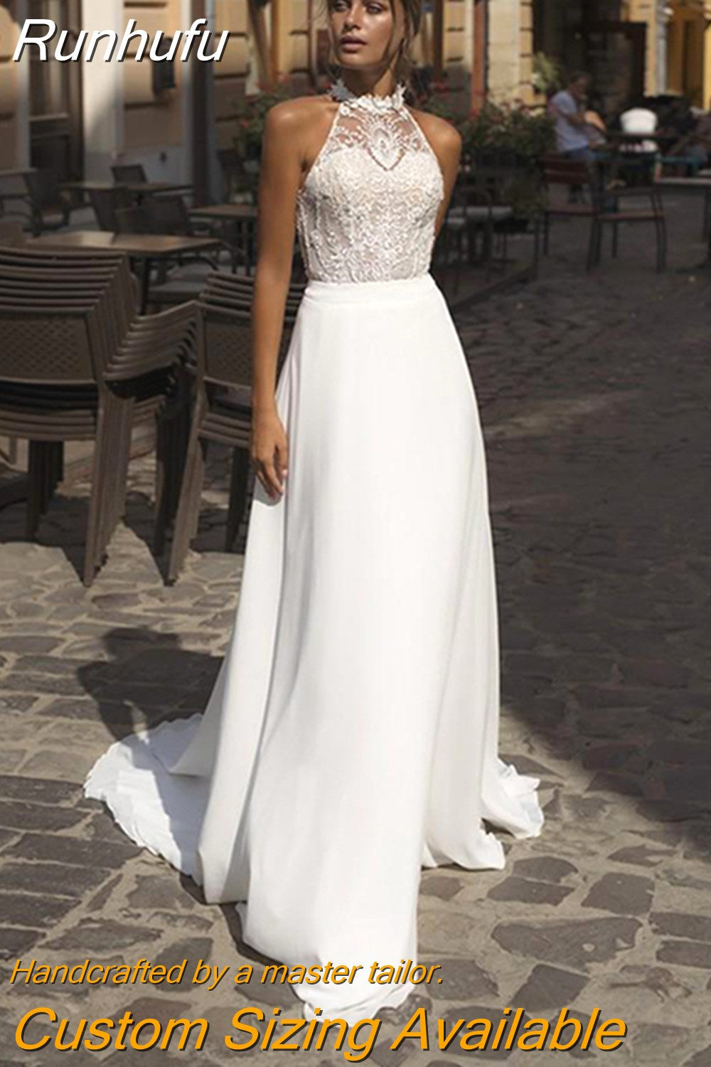 Runhufu Simple Halter Collar Wedding Dress White Sexy High Split Jewel Neck Chiffon Boho Bridal Dress Beach Wedding Gowns