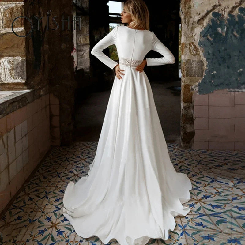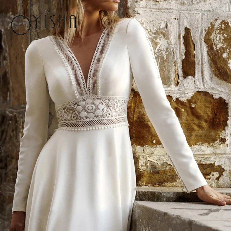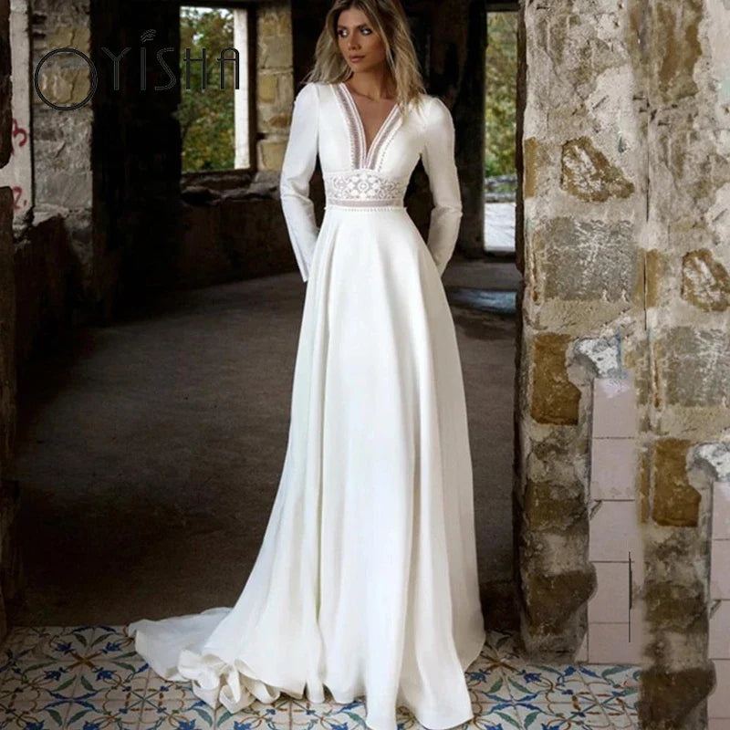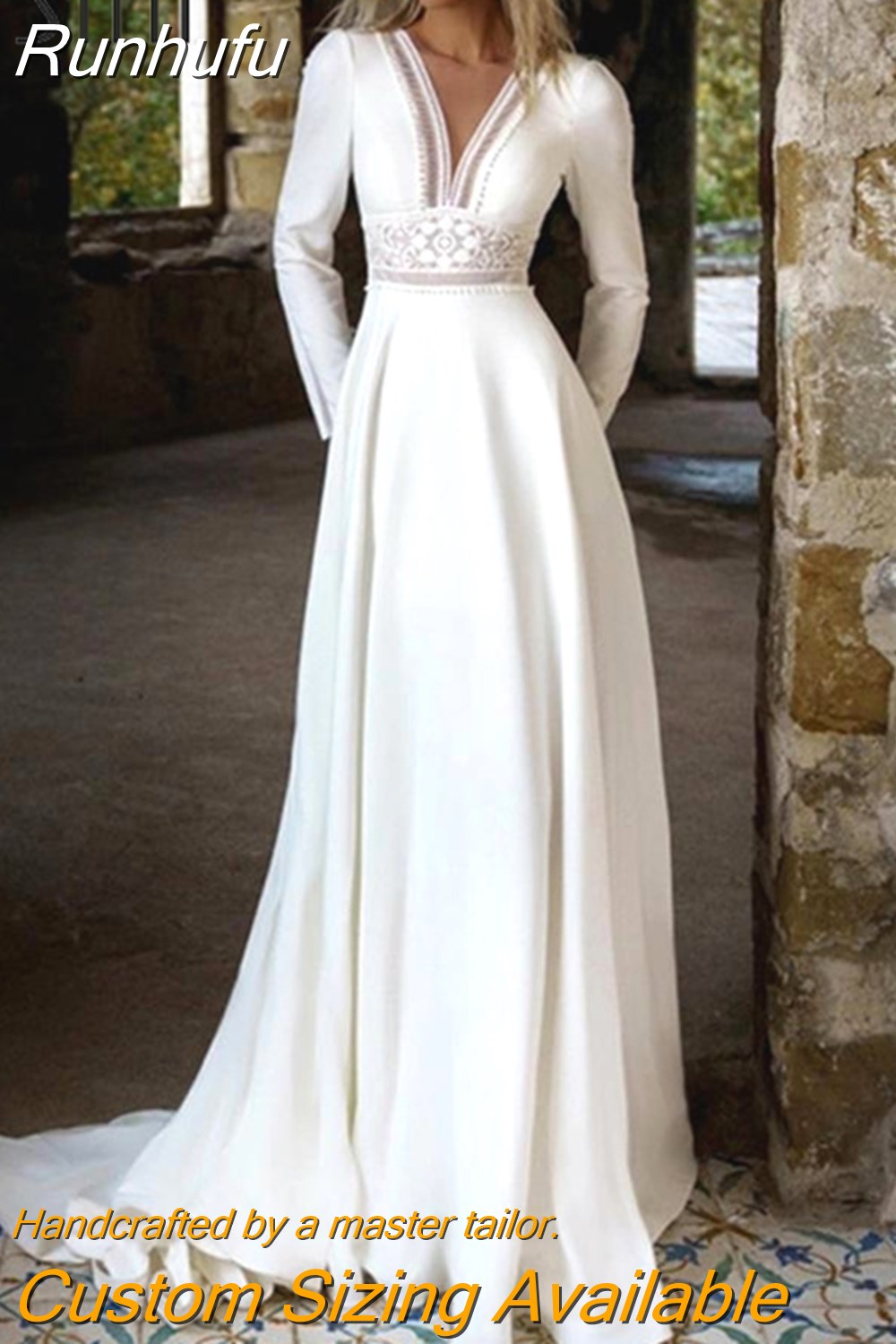 Runhufu Simple Satin Bridal Gowns Deep V-Neck Long Sleeves Wedding Dresses For Women 2023 Lace Appliques A-Line vestidos de noiva