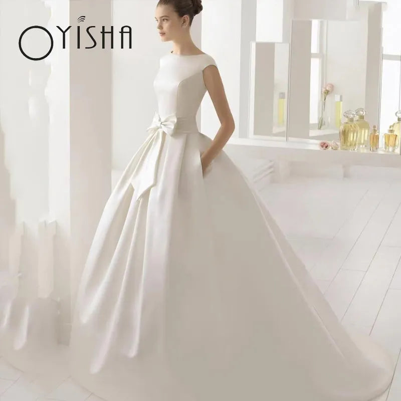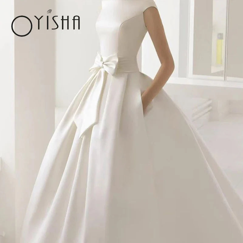 Runhufu Simple Satin Wedding Dresses For Bride 2023 Illusion Back Appliques Lace Bridal Gowns Bow Button A-Line Vestidos De Novia