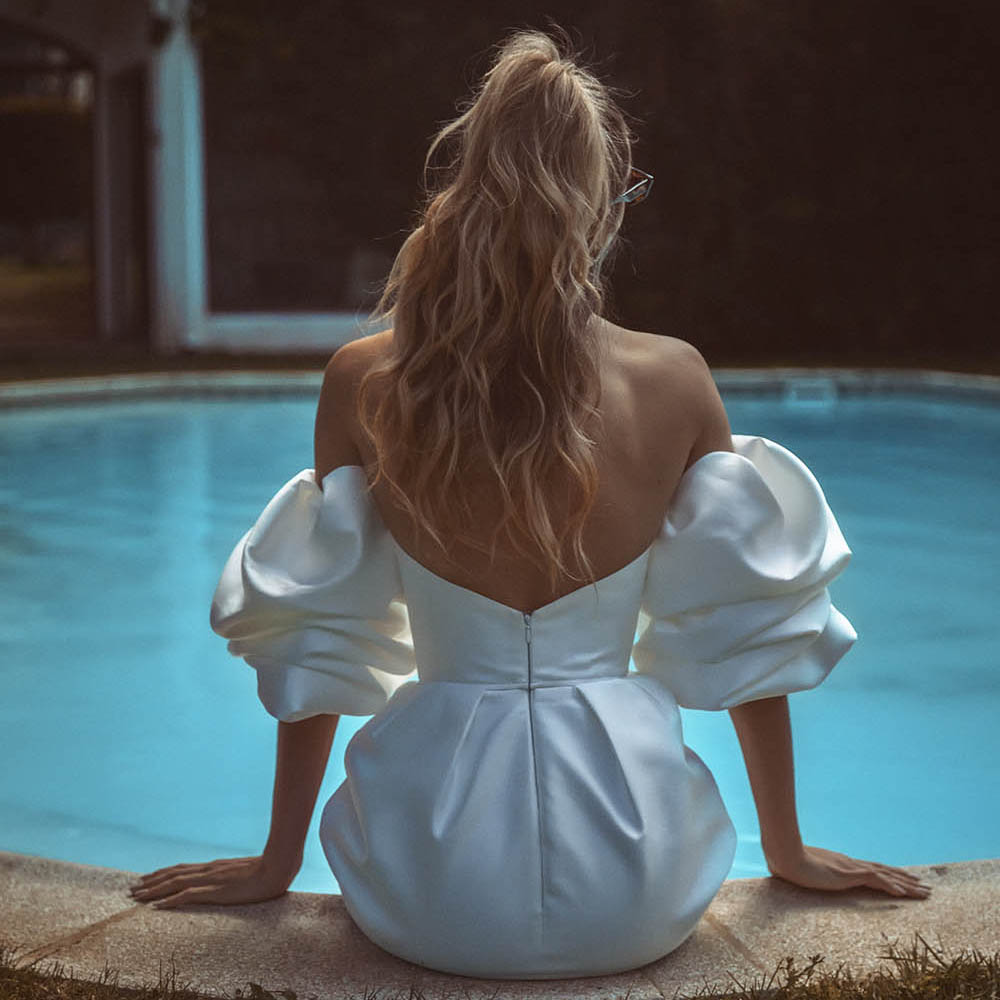 Runhufu Simple Strapless Short Wedding Dress For women 2023 Detachable Puff Sleeves Backless A-Line Satin Vintage Bridal Gown