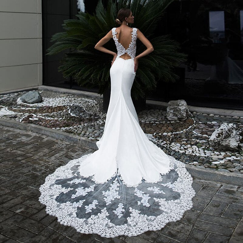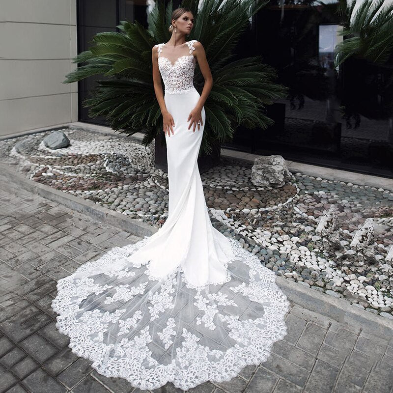 Runhufu Sleeveless Mermaid Wedding Dresses 2023 Sheer Scoop Neck Lace Appliques Vintage Bridal Gown Blackless Sweep Train