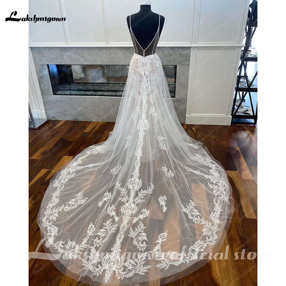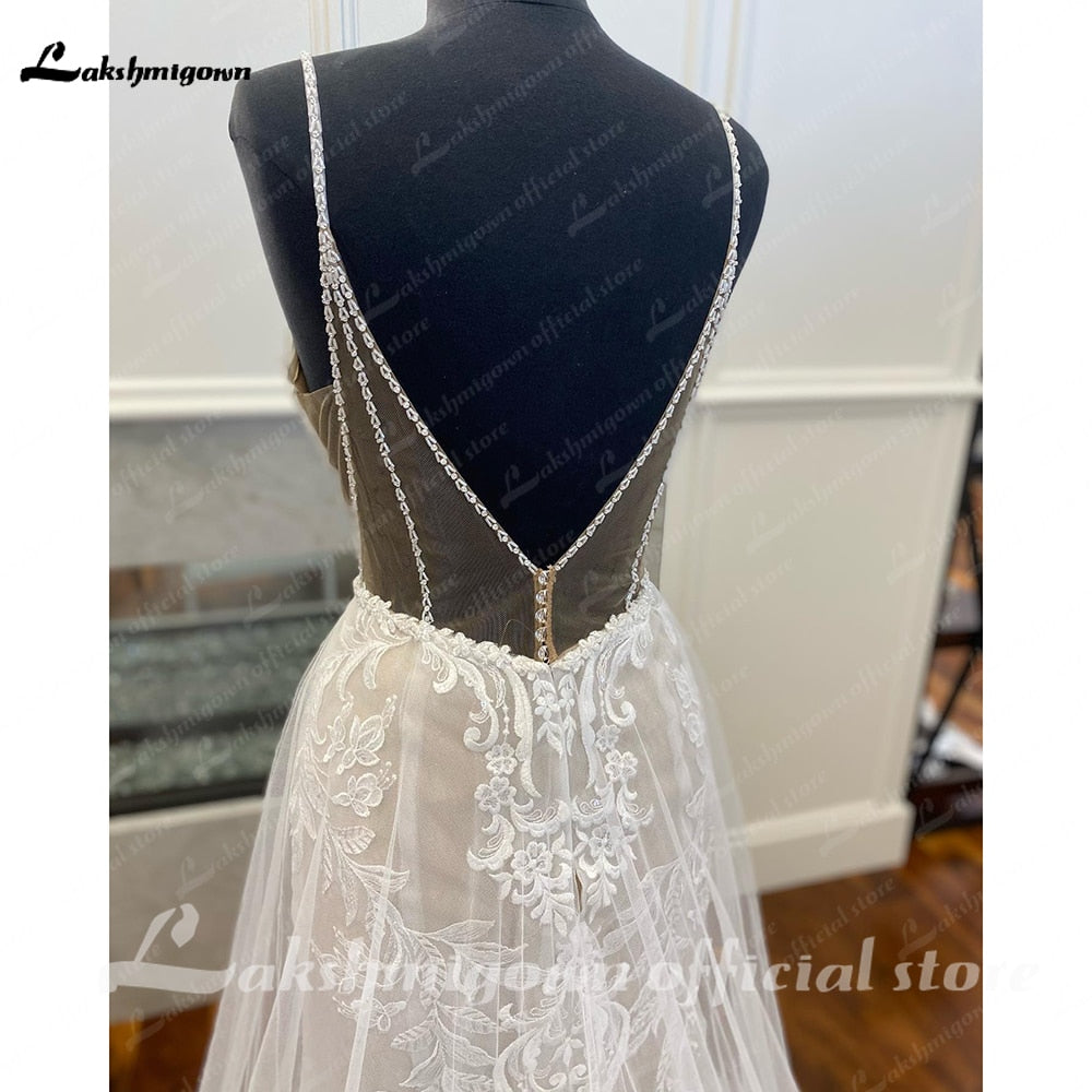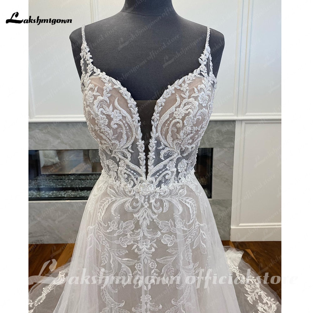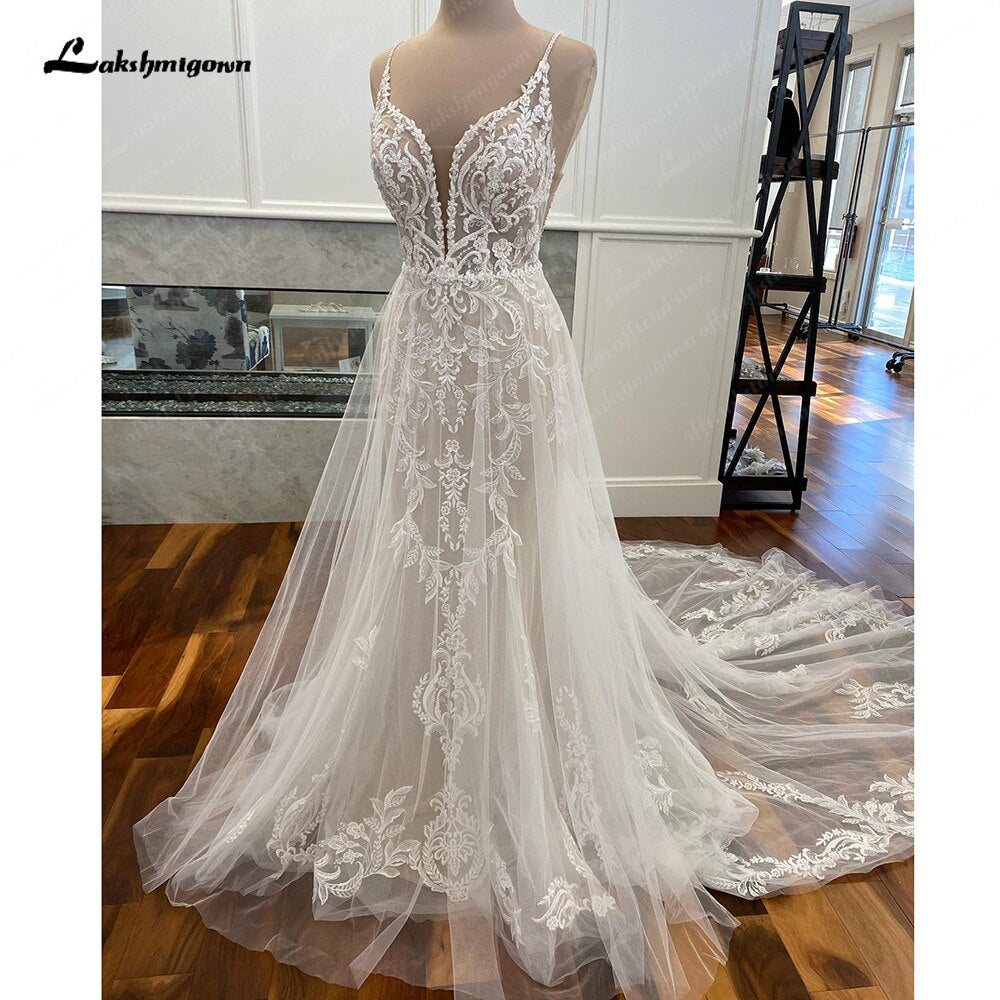 runhufu Spaghetti Straps A Line Tulle Wedding Dress For Women 2023 Sexy Bridal Boho Beach Wedding Gowns Lace Backless