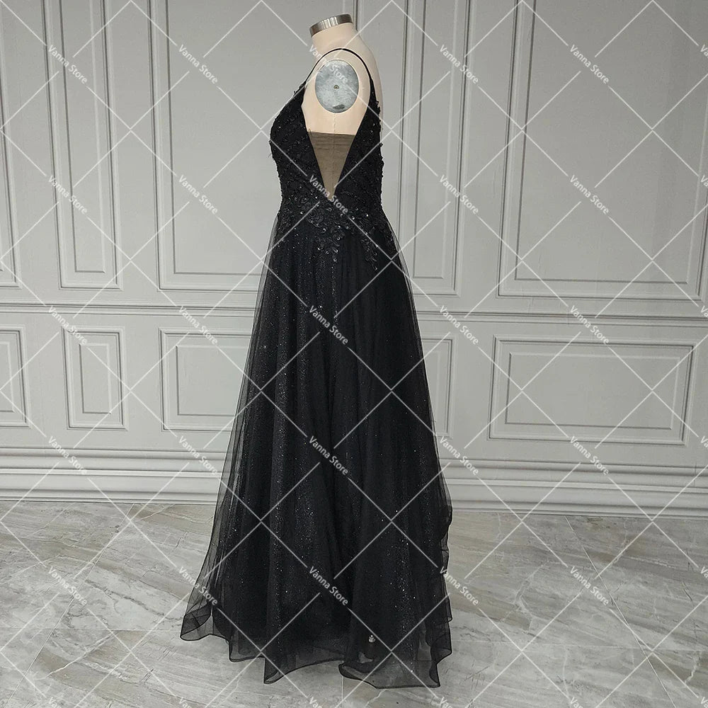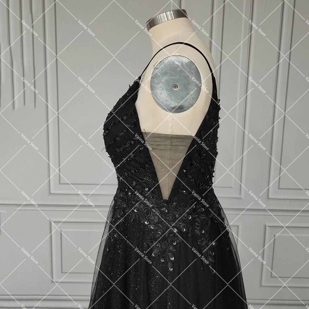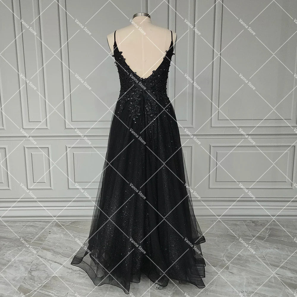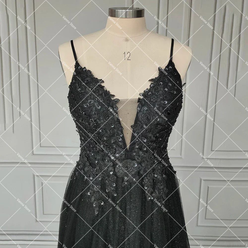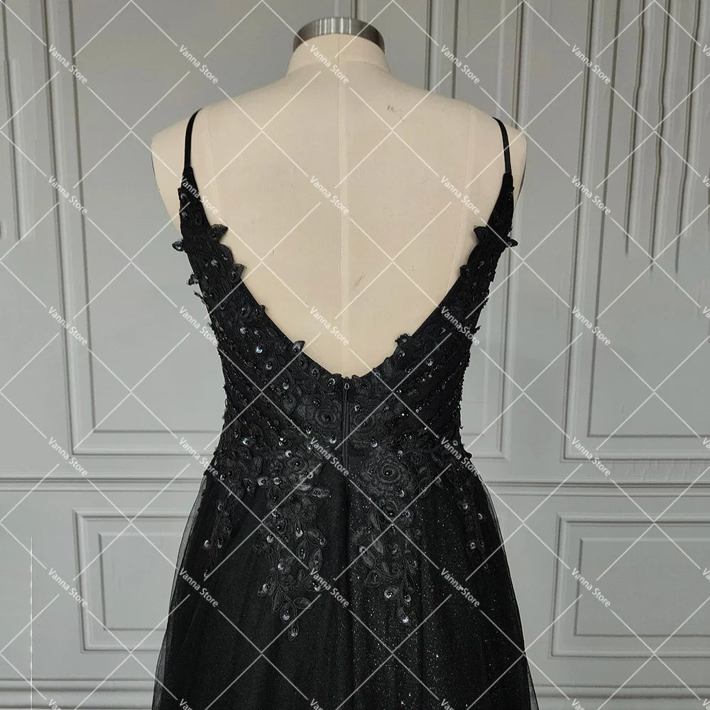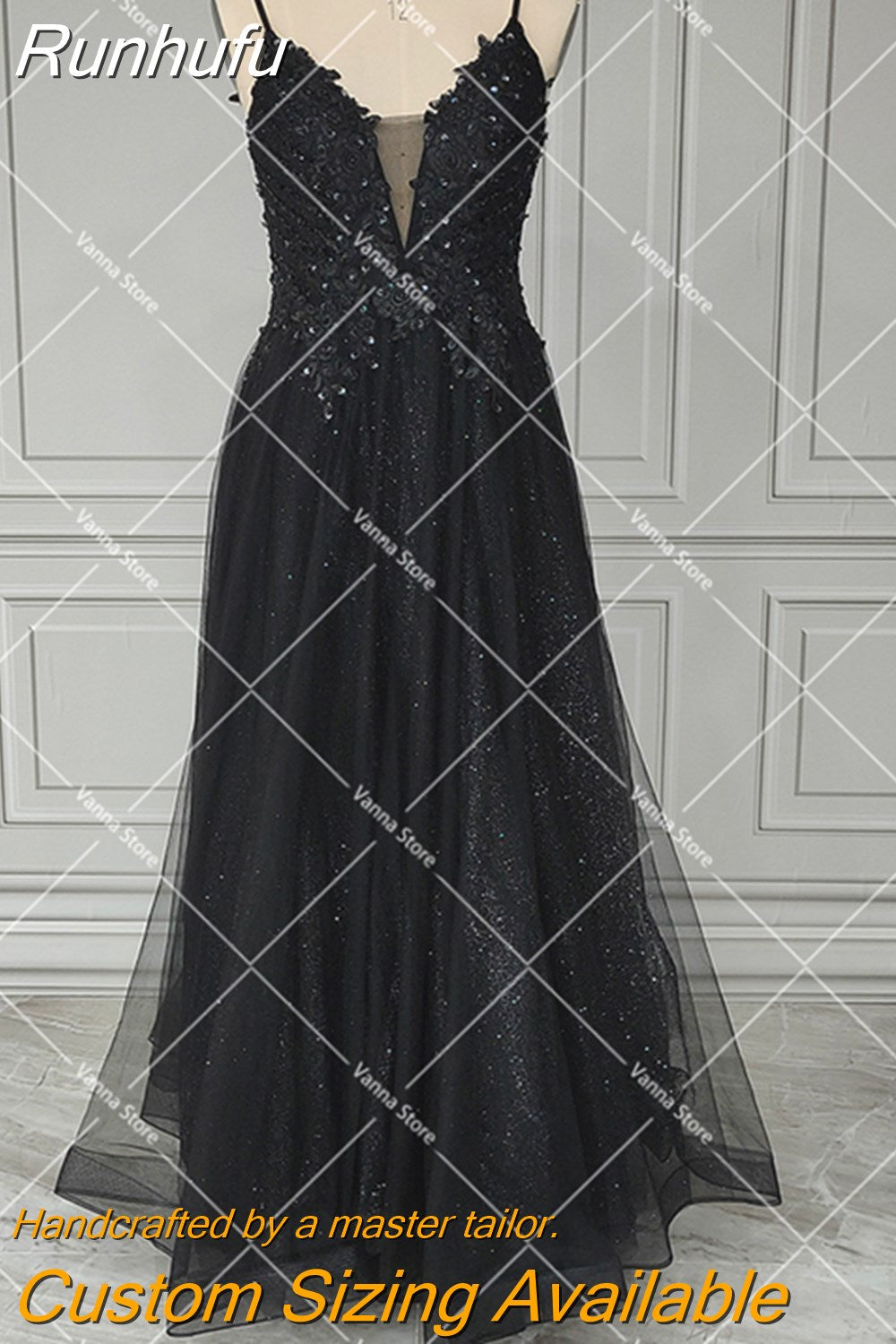 Runhufu Spaghetti Straps Shimmer Tulle Beading Wedding Dress Custom Made Gothic Halloween Plunging Low V Backless Brial Gowns