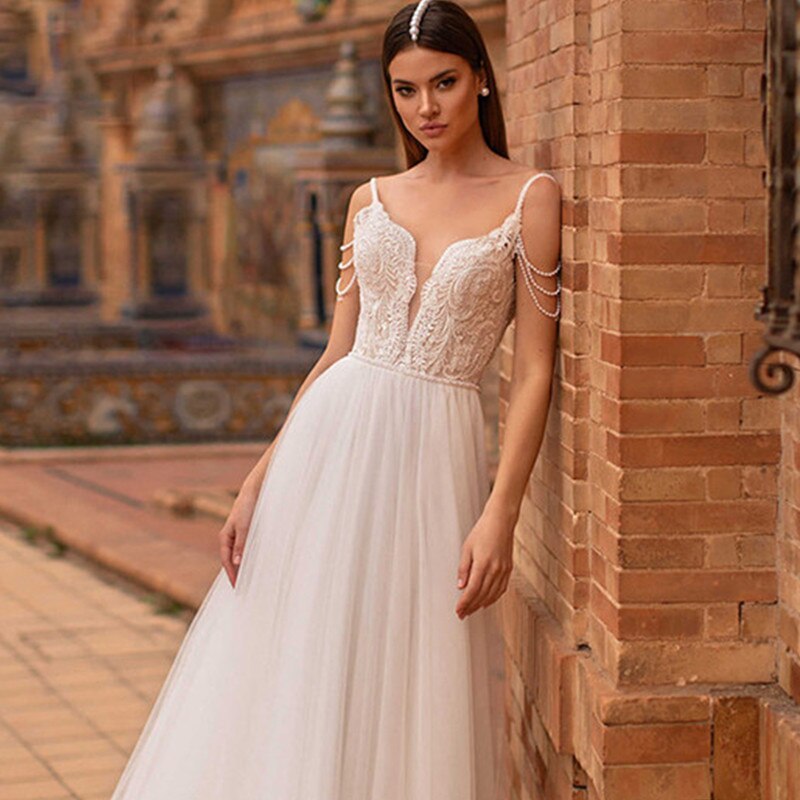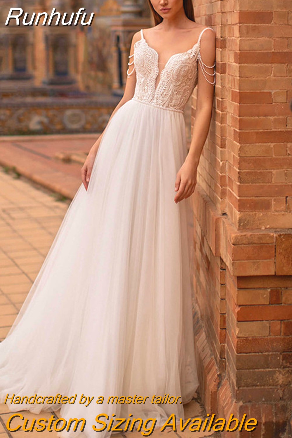Runhufu Spaghetti Straps Wedding Dress Sleeveless 2023 Lace Fashion Beads Tulle Bride Dress V-neck Backless A-Line Vestido De Novia