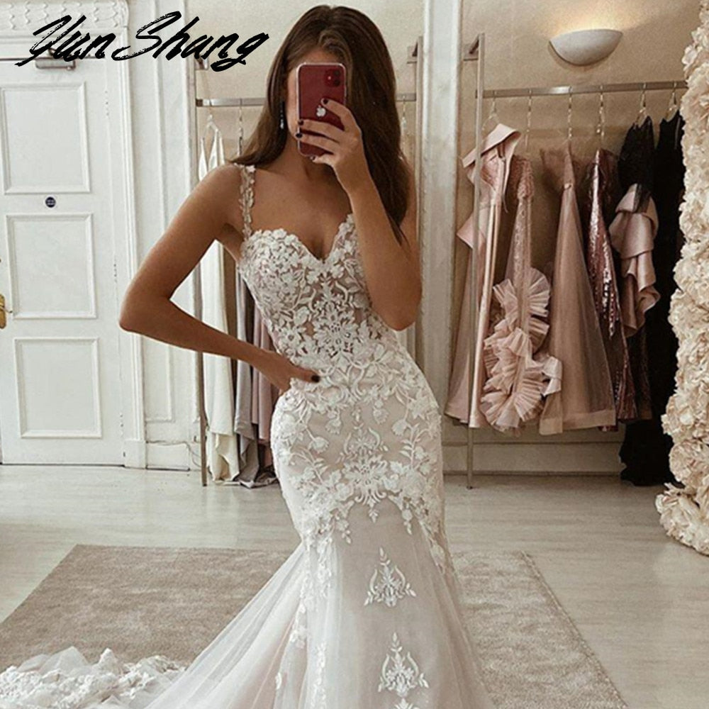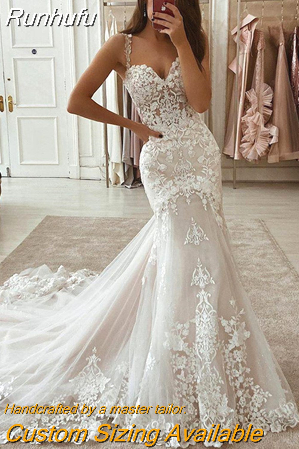 Runhufu Spaghetti Straps Wedding Dress V-Neck Lace Appliques New Sexy Mermaid Bride Gown Backless Court Train Vestidos De Noiva