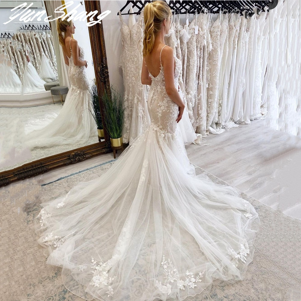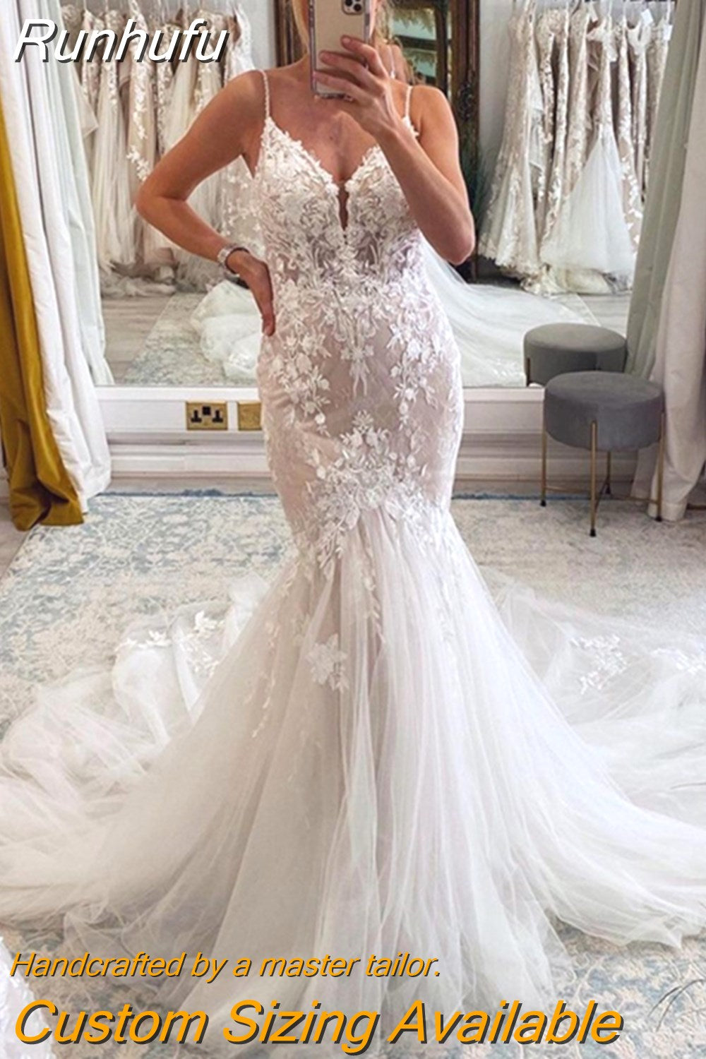 Runhufu Spaghetti Straps Wedding Dresses V-Neck Mermaid Sleeveless Backless Bride Gown Lace Appliques Zipper Vestidos De Noiva