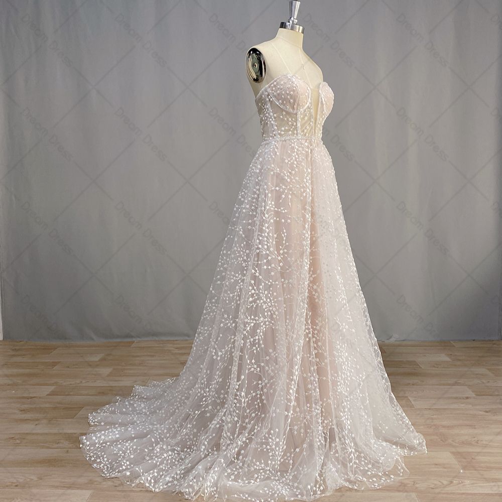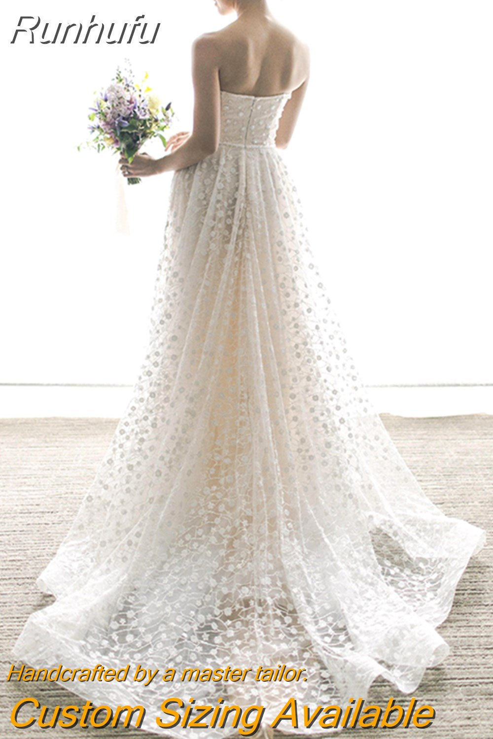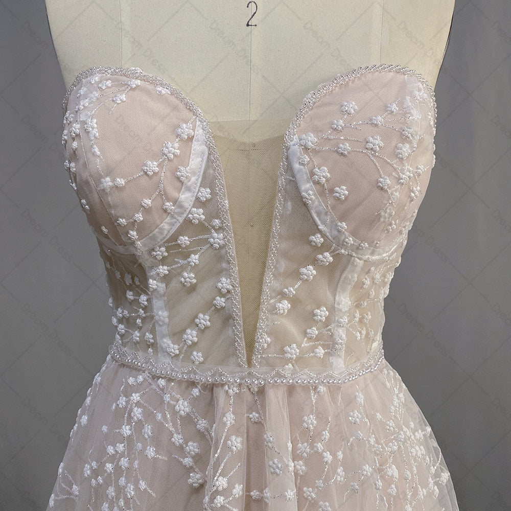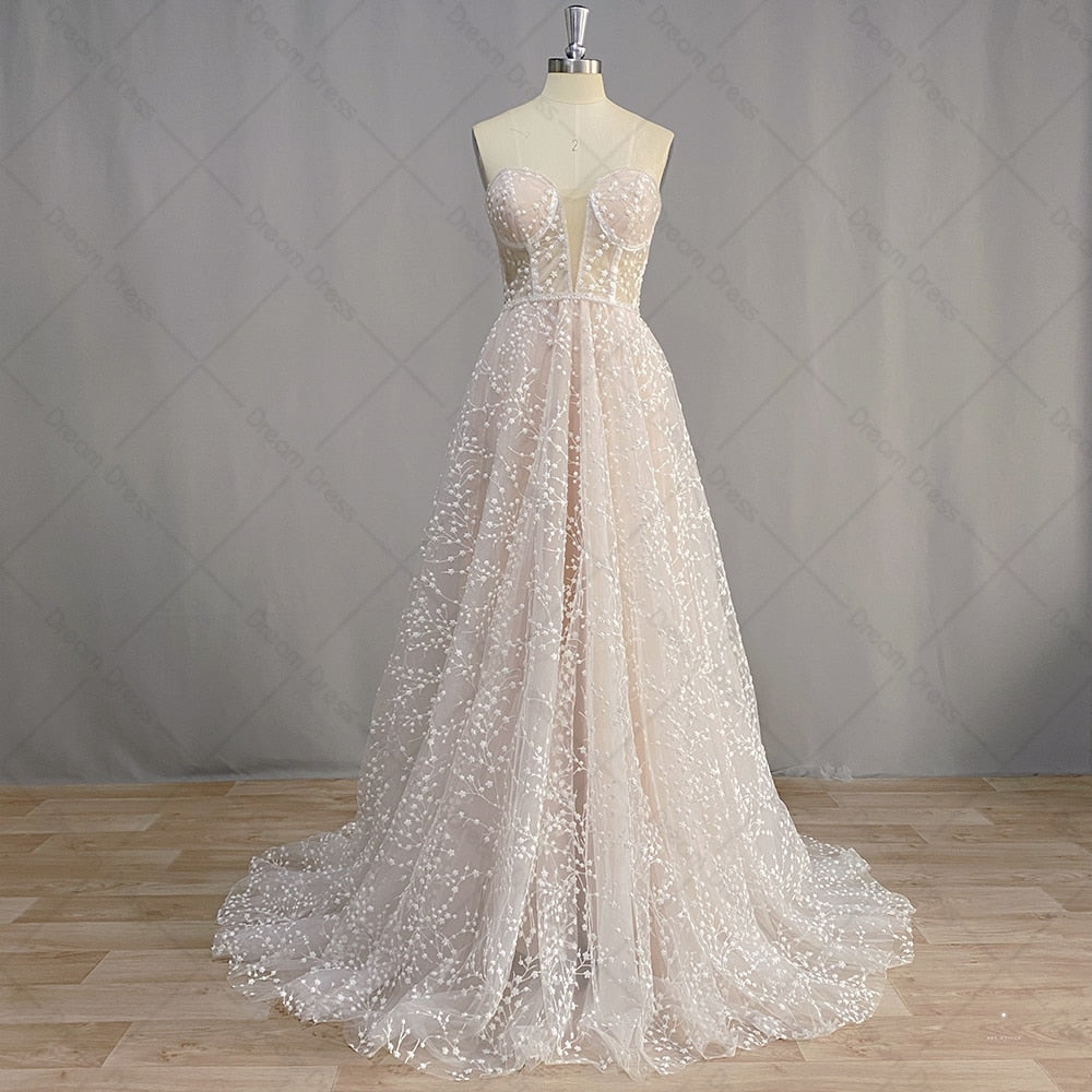 Runhufu Sparkly Flowers Strapless Tulle Wedding Dress 2023 Princess Sweetheart Lace A Line Bridal Gown Lace Appliques