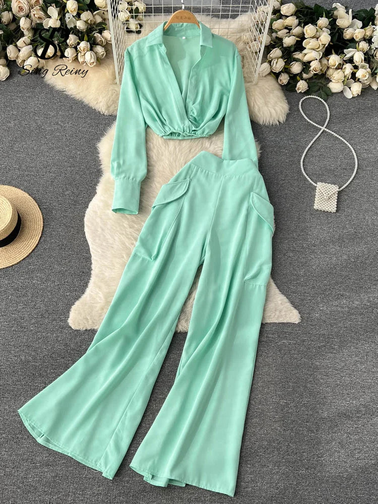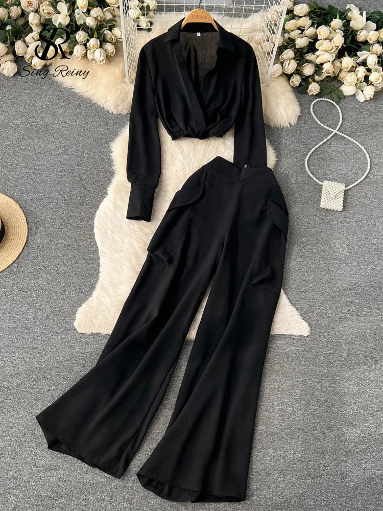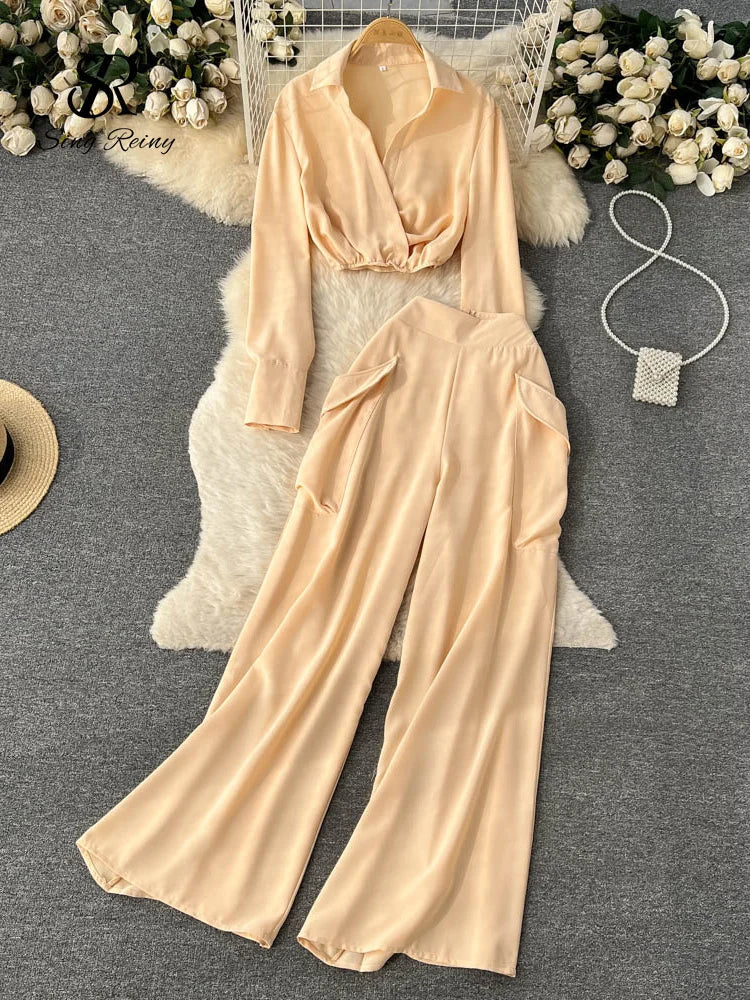Runhufu Spring Fashion OL Two Pieces Suits Lapel Neck Blouse+Pocket Wide Leg Long Pant 2024 Women Streetwear Retro Casual Sets
