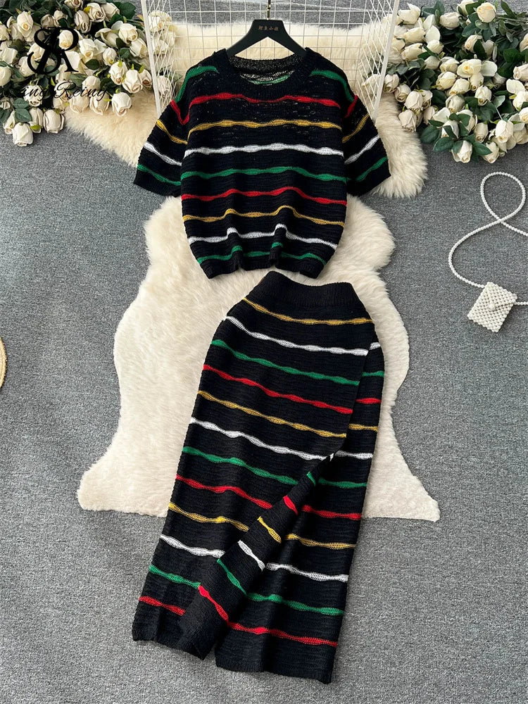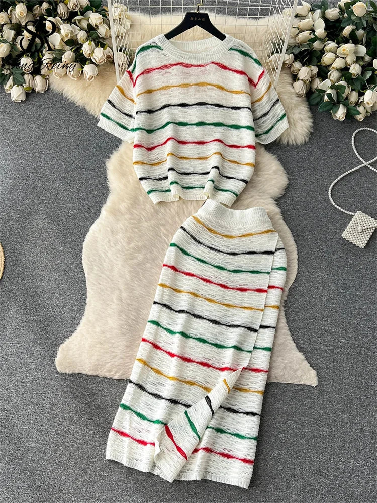 Runhufu Summer Knit Casual Two Pieces Sets Women Loose Short Camisole+ Skinny Long Dress Retro Stripe Hollow Out Design Suit