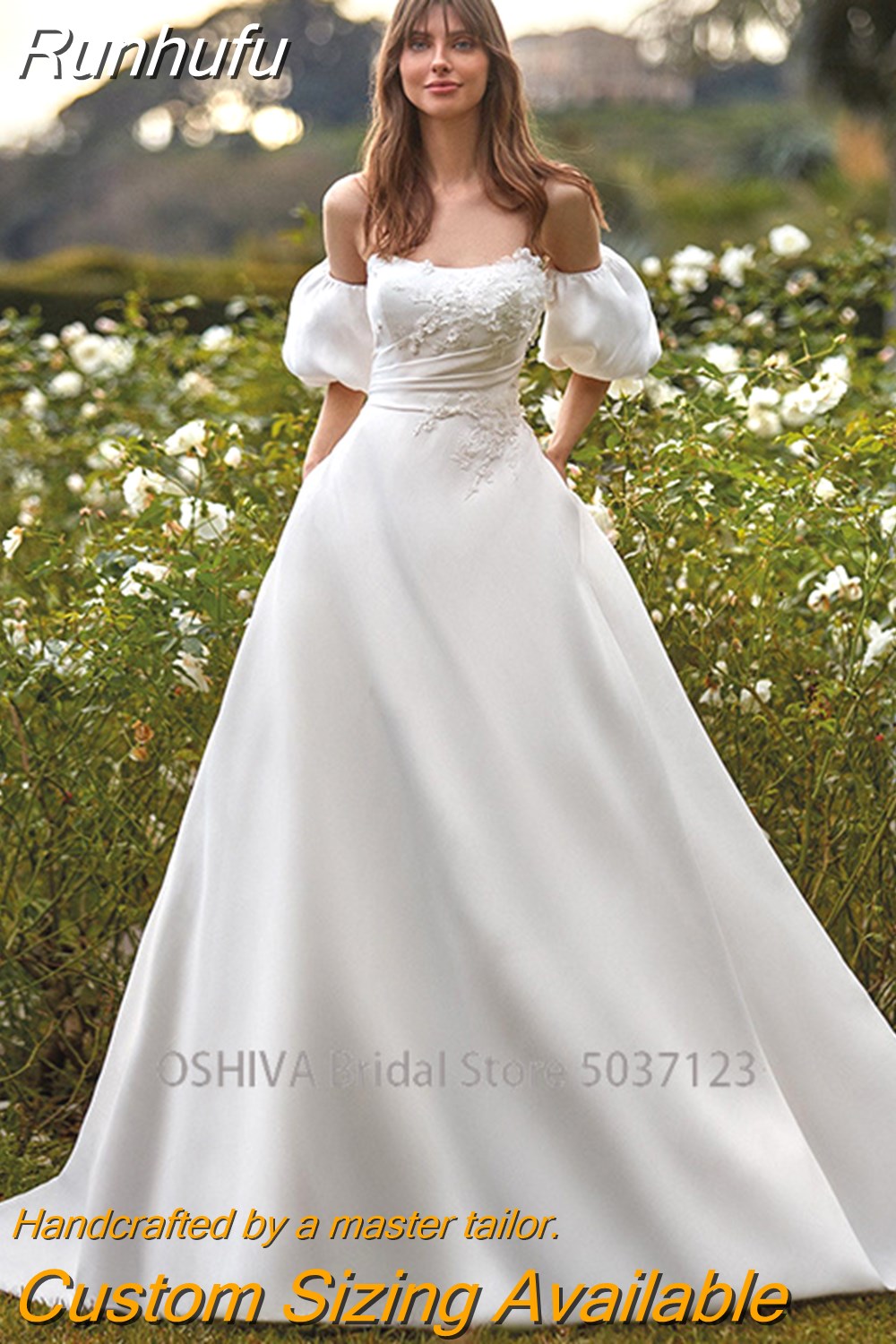 Runhufu NICEB 3/4 Lace Sleeves Wedding Dresses With Pocket Satin Sweep Train свадебное платье Bridal Ball Gowns Simple Customized