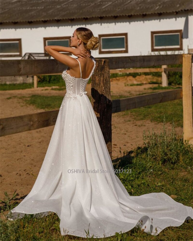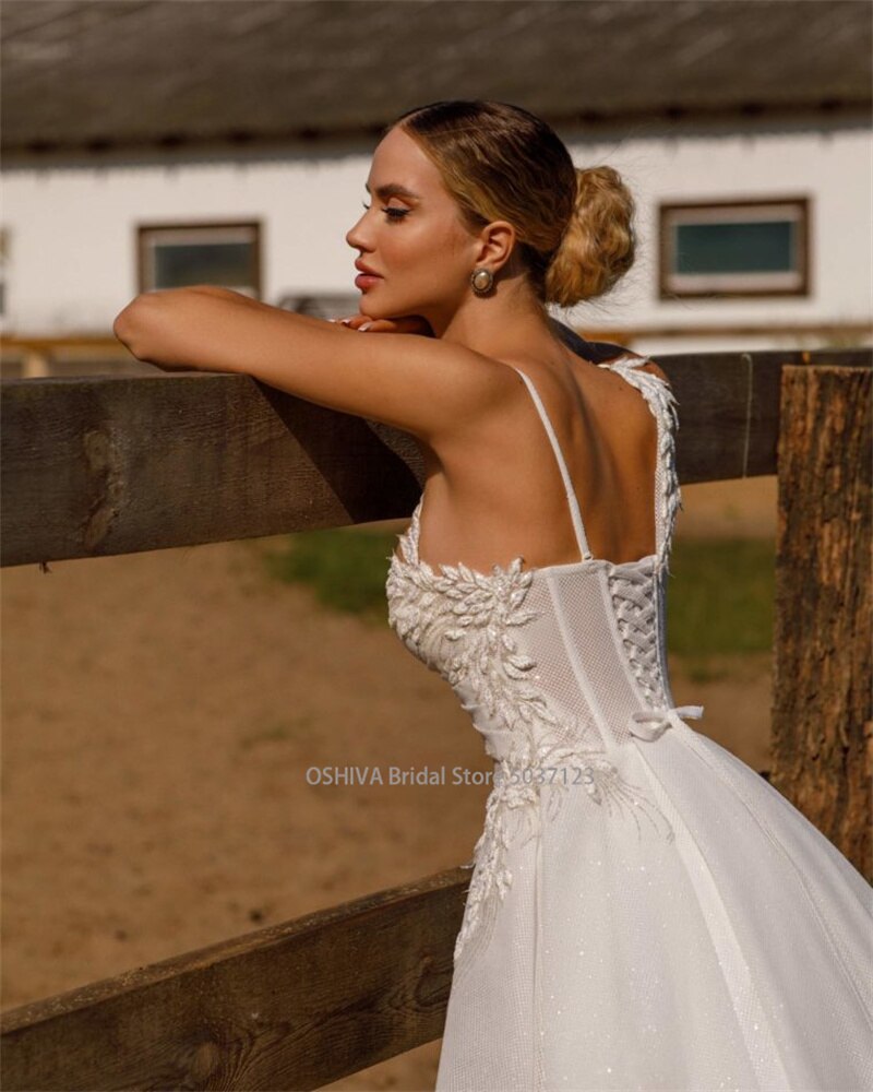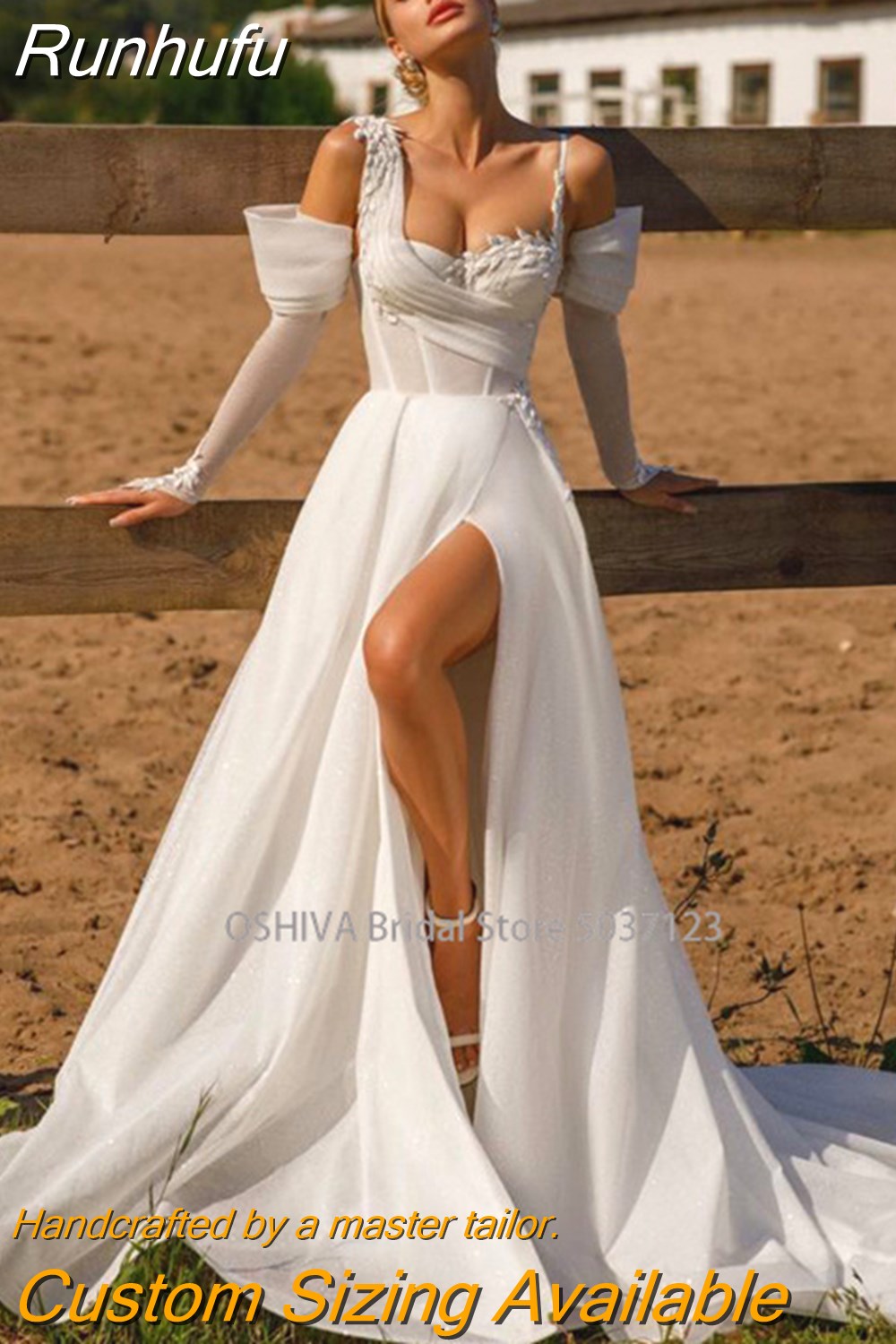 Runhufu Sweetheart Neckline A-Line Wedding Dresses Spaghetti Straps Long Sleeves Beach Bridal Gown Vestido Noiva