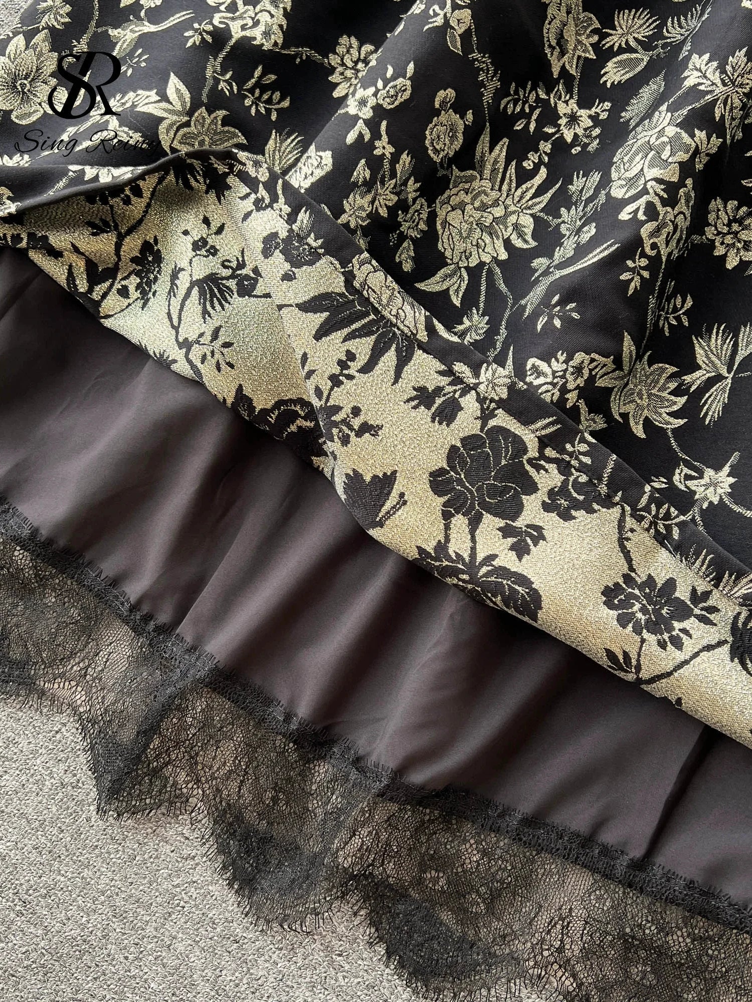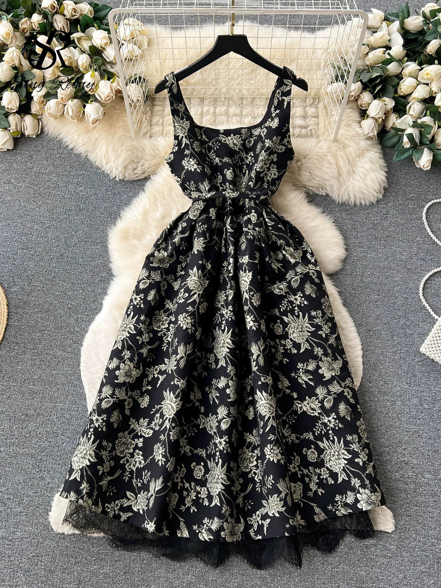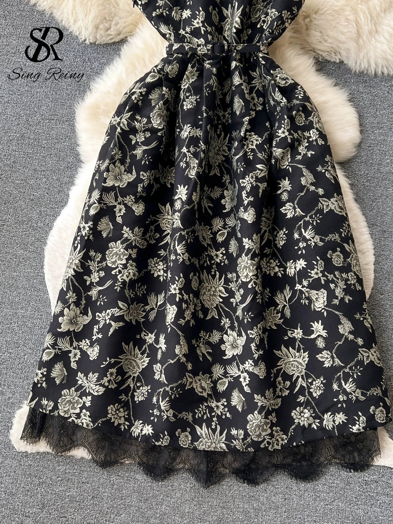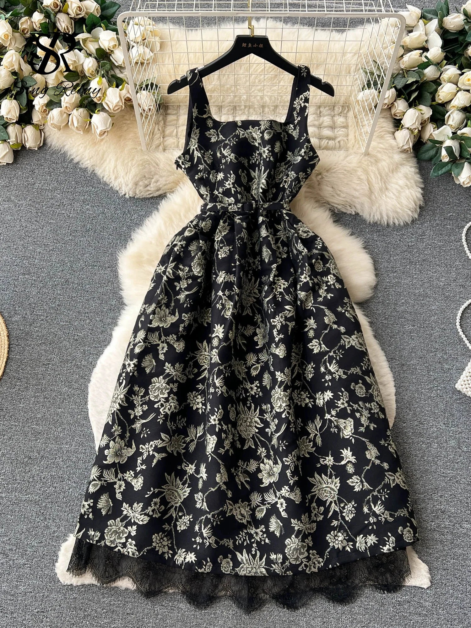 Runhufu Temperament Embroidery Lace Dress Women Zipper Belt Off Shoulder Sleeveless French Floral Spaghetti Strap Long Dress