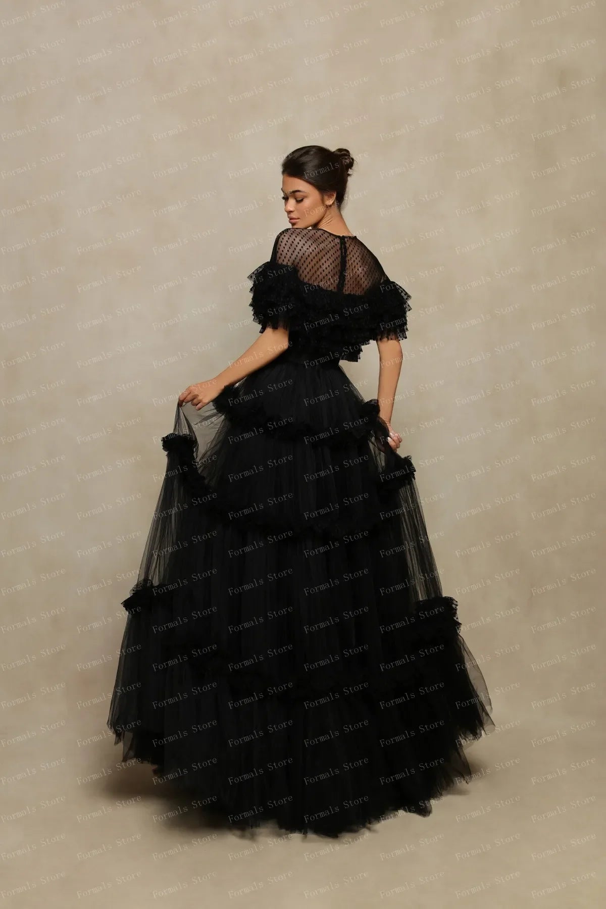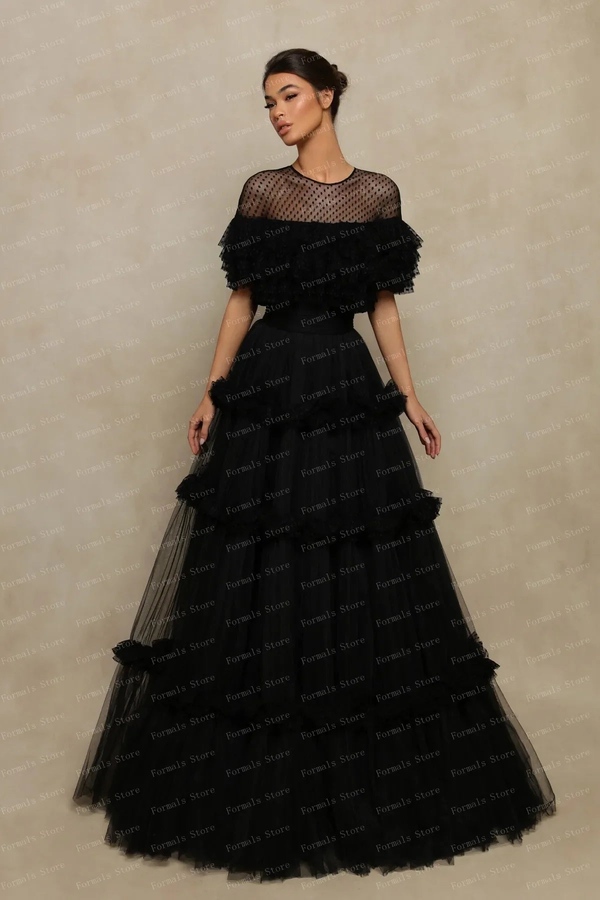 Runhufu Throught Black Tulle Ball Gown O-neck Woman Clothes A-line Evening Dresses For Women Ruffled Prom Dress Short Sleeve Gown