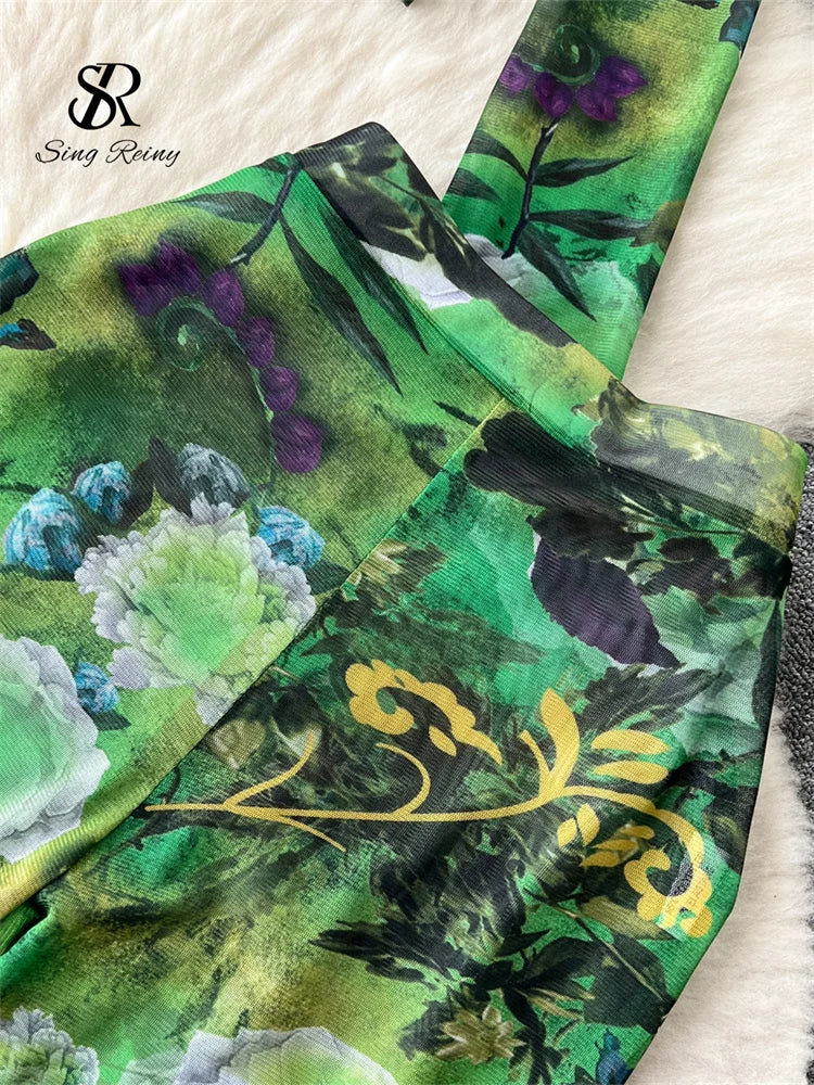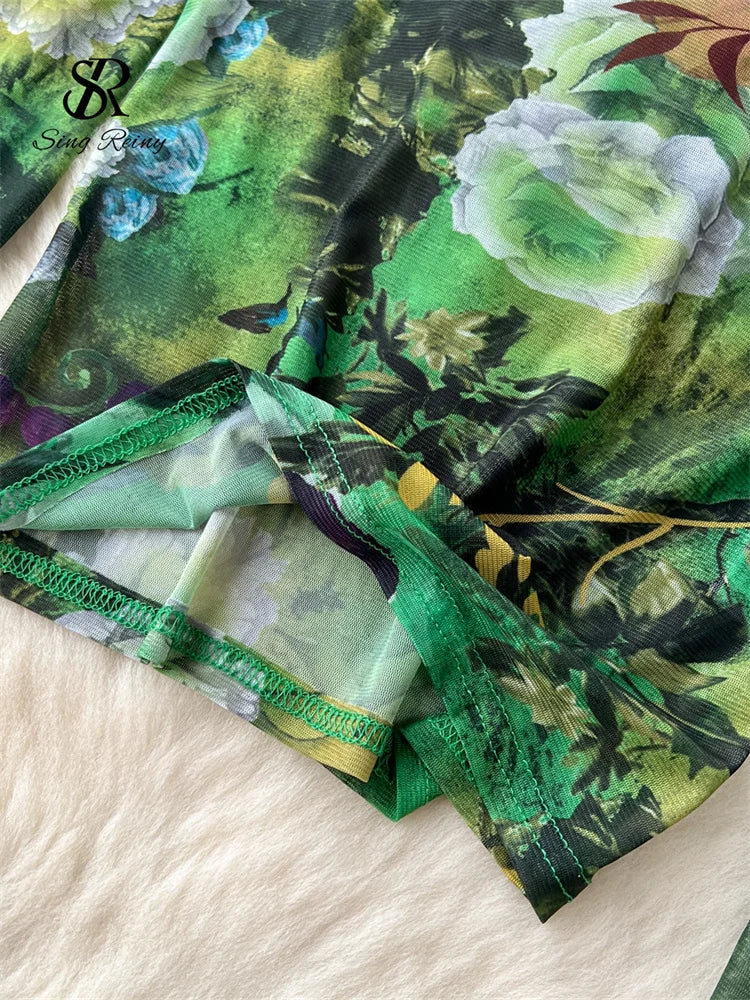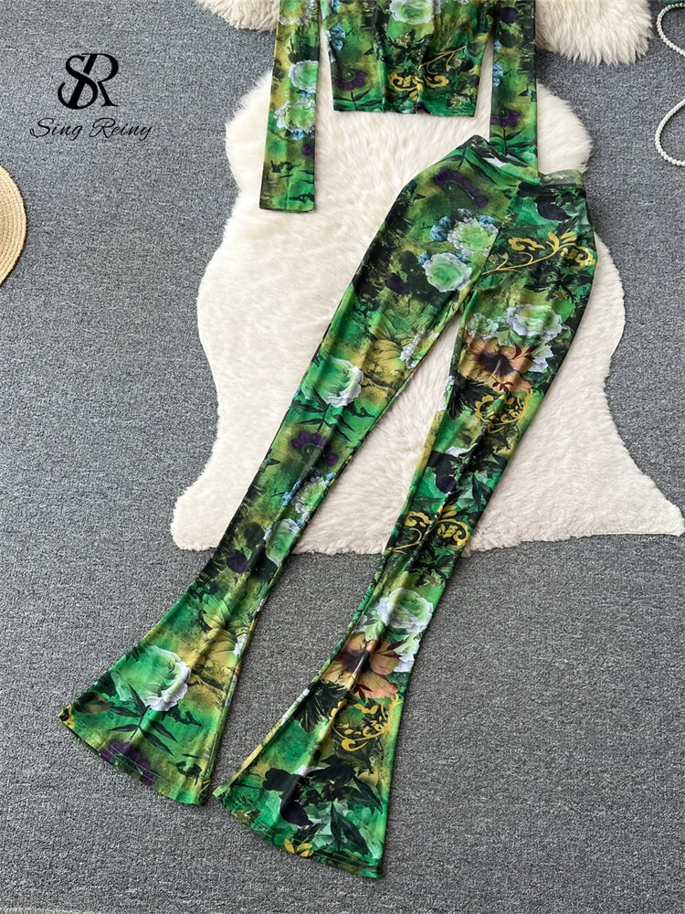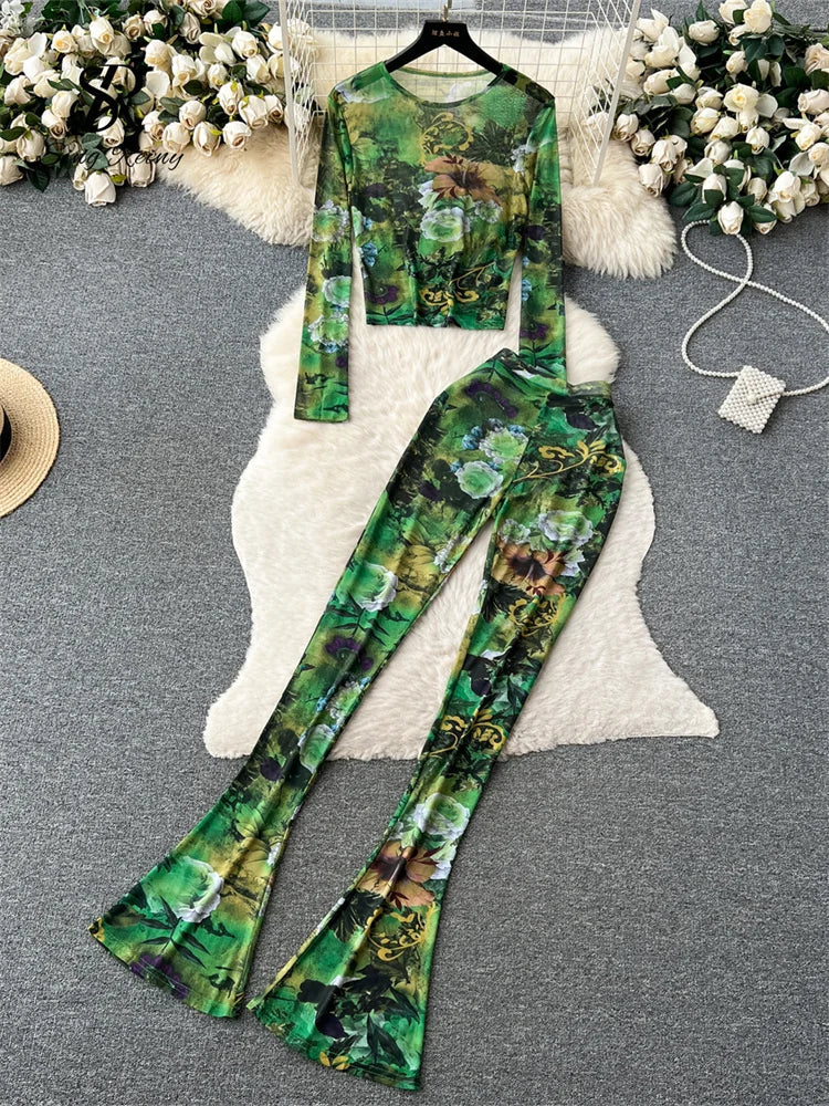 Runhufu Transparent Print Women Suits O Neck Long Sleeve Top+Flare Pants 2024 Streetwear American Vintage Slim Two Pieces Sets