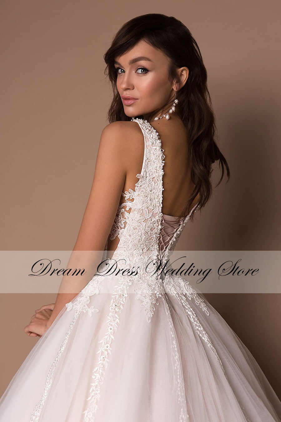 Runhufu Tulle Deep V-Neck Sleeveless Princess Wedding Dresses 2023 Lace Up Beads Applique Bridal Dress Ball Gown Vestidos De Novia