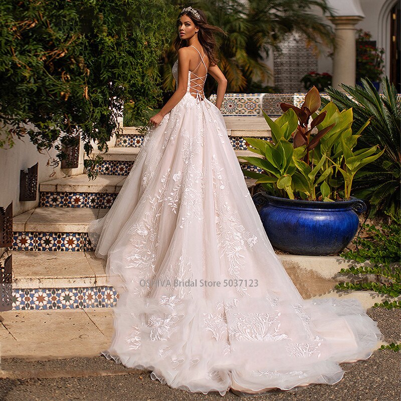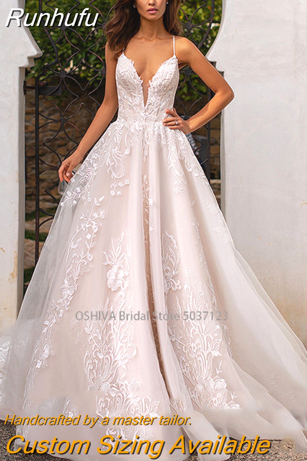 Runhufu V-Neck A-Line Wedding Dresses Spaghetti Straps Lace Appliques Princess Floor Length Bridal Gowns