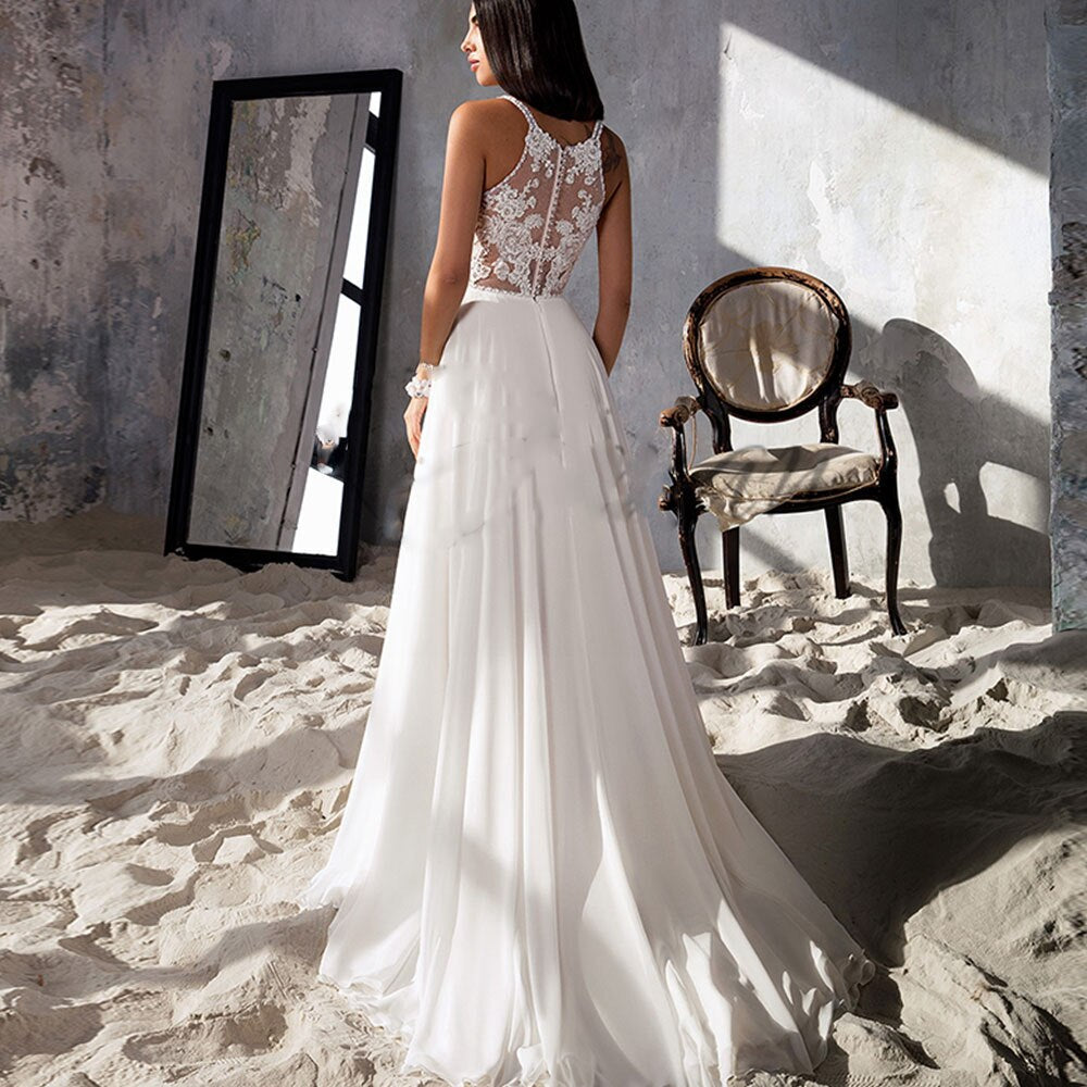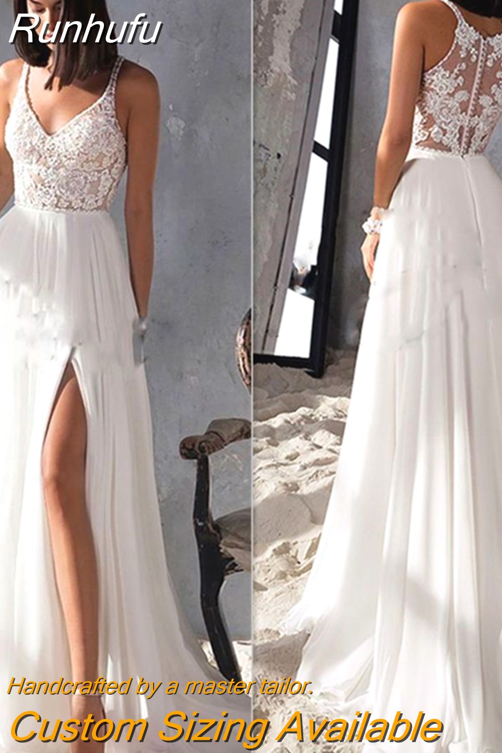 Runhufu V-Neck Front High Split Wedding Dresses For Women Custom Made 2023 Lace Appliques Chiffon Spaghetti Straps Bridal Gown