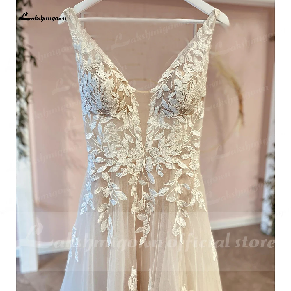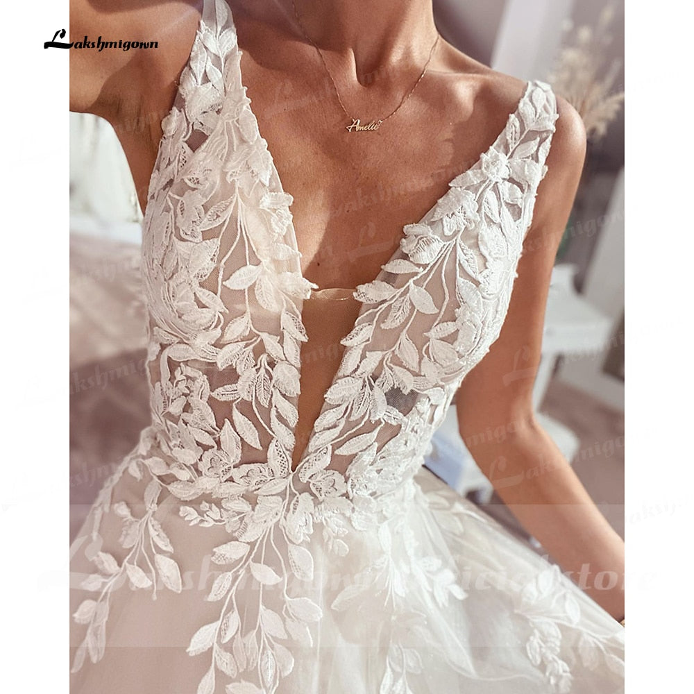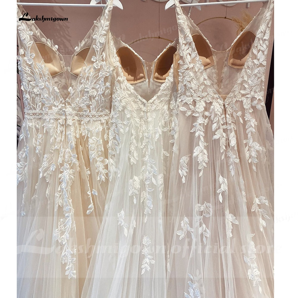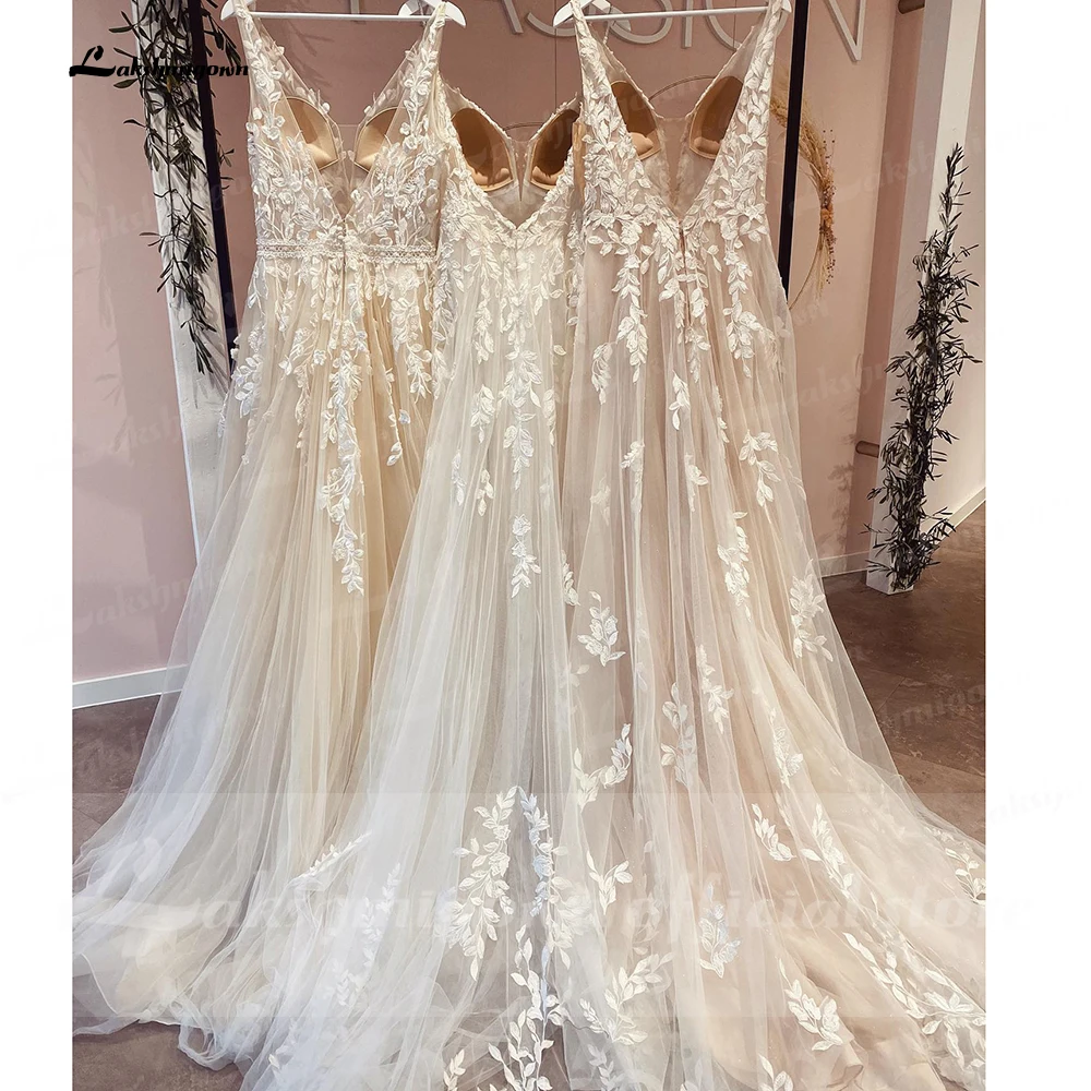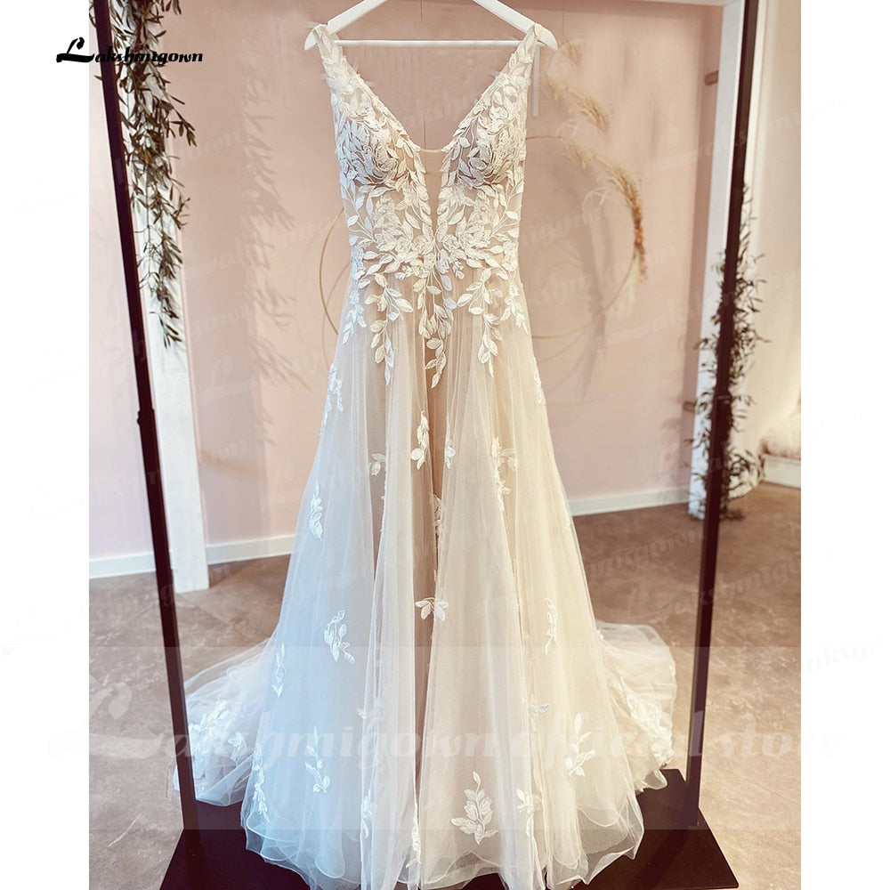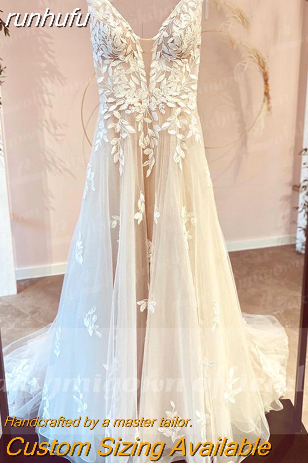 runhufu V Neck Lace Appliques Wedding Dresses Champagne Bridal Gowns A Line Wedding Gown estido de noiva praiano
