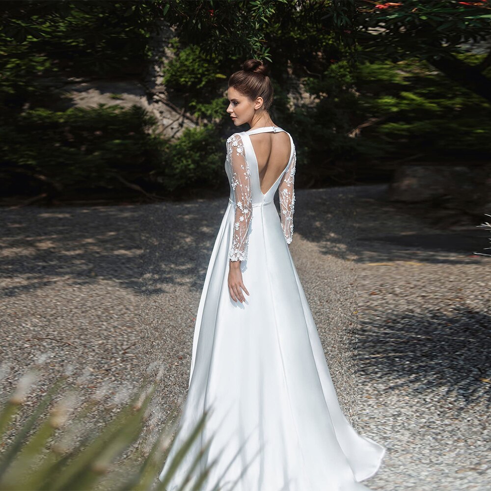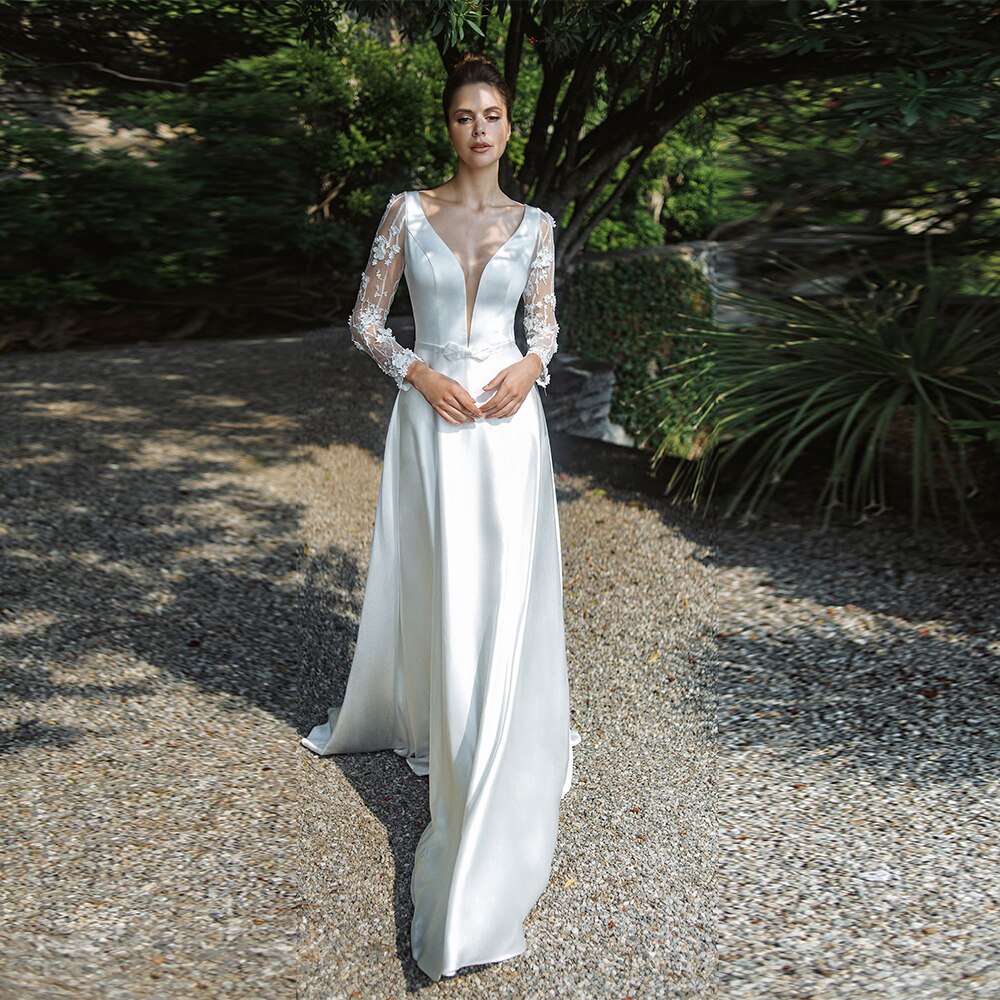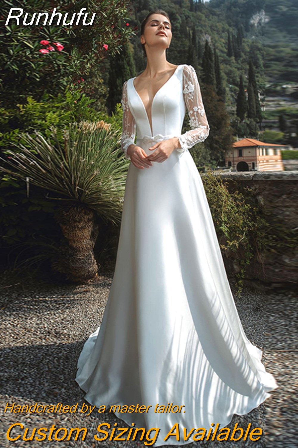 Runhufu V-Neck Long Sleeves Lace Appliques Wedding Dress 2023 Boho White Satin Sweep Train Backless Bridal Gown With Bow Belt