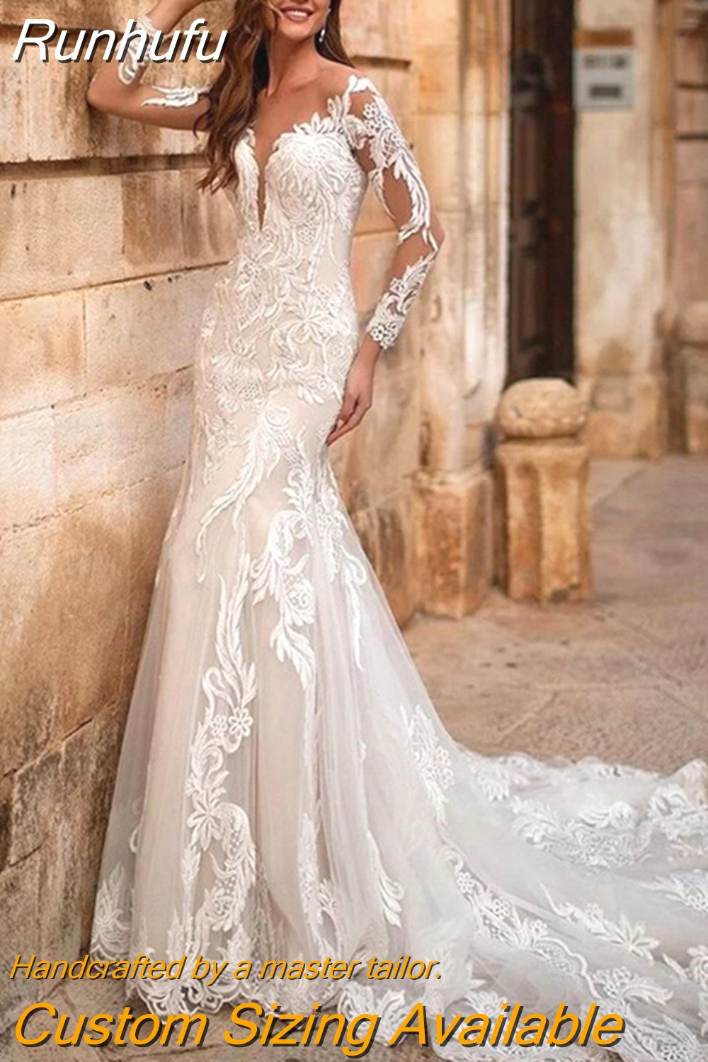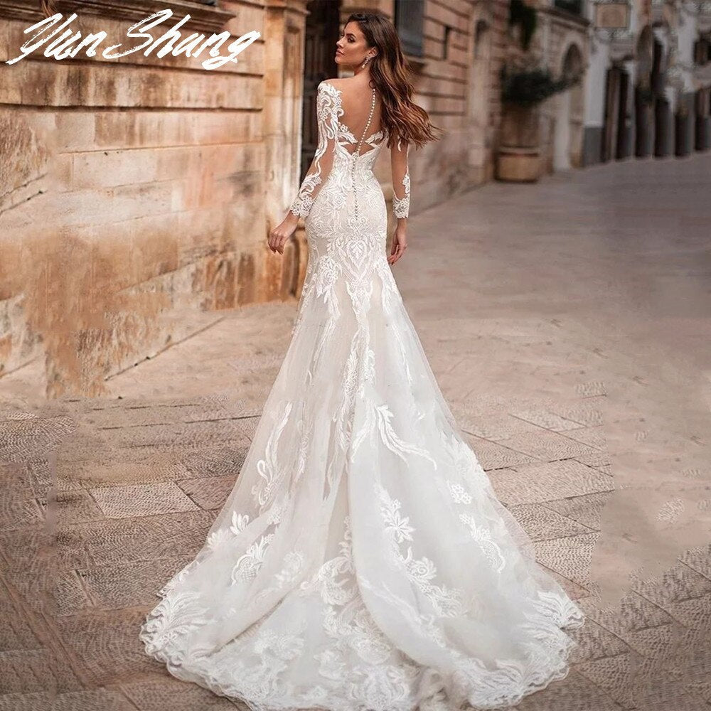 Runhufu V-Neck Mermaid Wedding Dress 2023 Long Sleeve Lace Appliques Bride Gown Backless Train Illusion Vestidos De Noiva