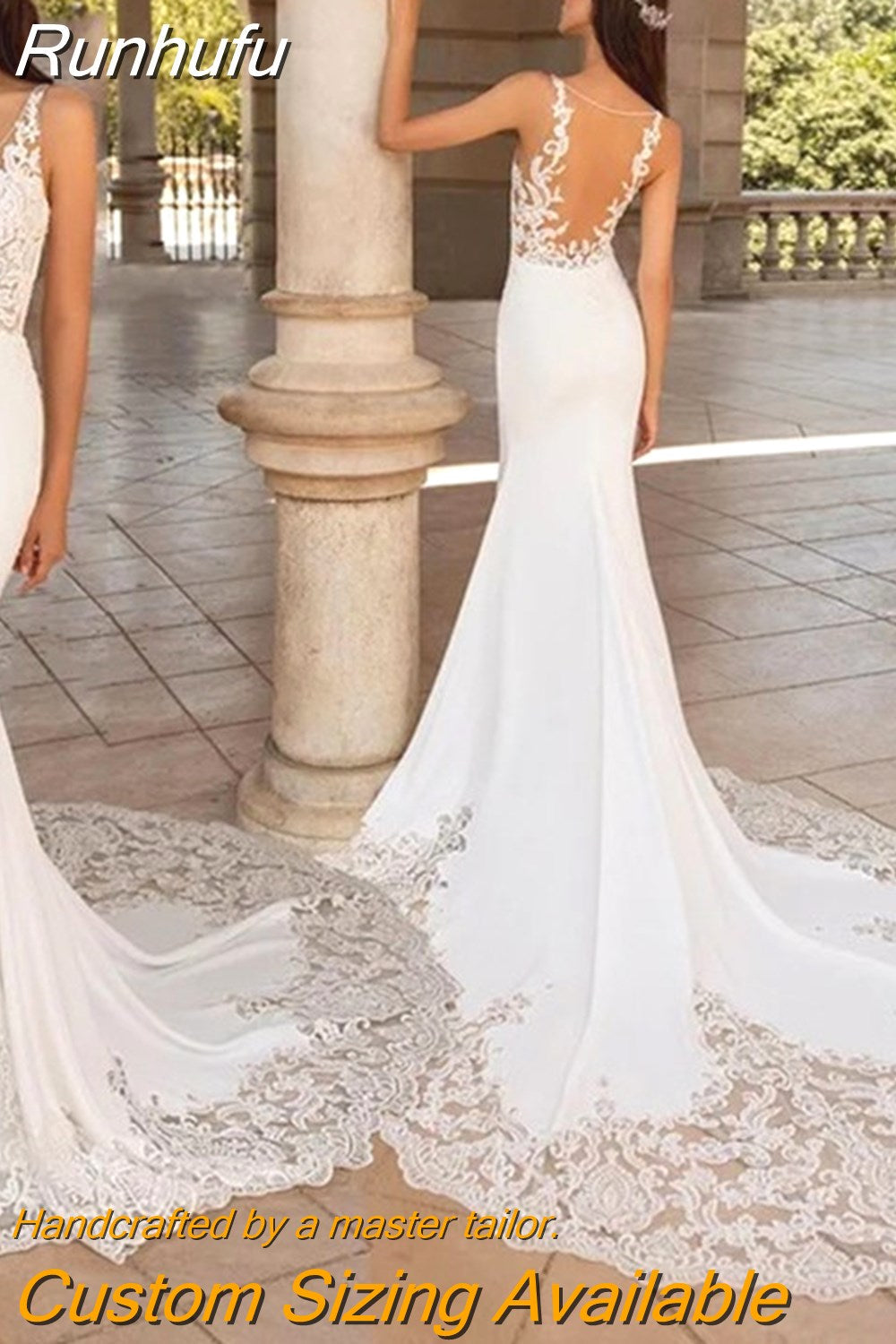 Runhufu V-Neck Mermaid Wedding Dresses With Long Train 2023 Lace Appliques Elegant Bride Gown For Women Sleeveless Backless