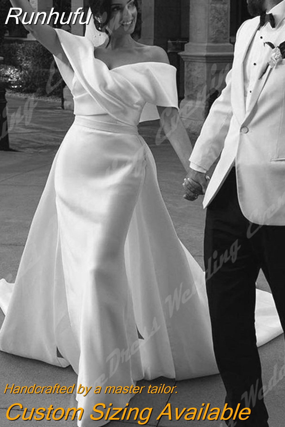 Runhufu V-Neck Off The Shoulder Wedding Mermaid Dress Sleeveless Satin Bohemian Bride Gown Traped Train Vestido De Novia