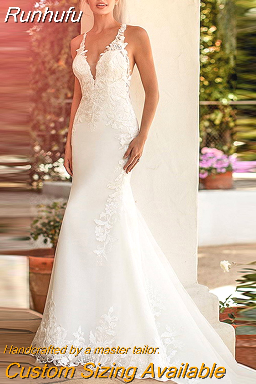 Runhufu V-Neck Sleeveless Boho Mermaid Wedding Dress For Women 2023 Lace Appliques Open Back Floor Length Bridal Gown Custom Made