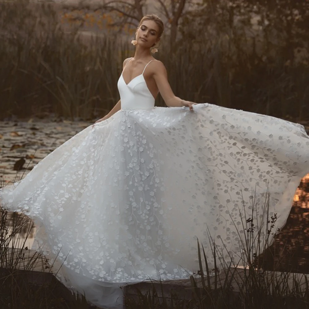 Runhufu V-Neck Spaghetti Straps sleevess Wedding Dress For Bride 2023 Lace Aqqliques Open Back A-Line Tulle Simple Bridal Gown