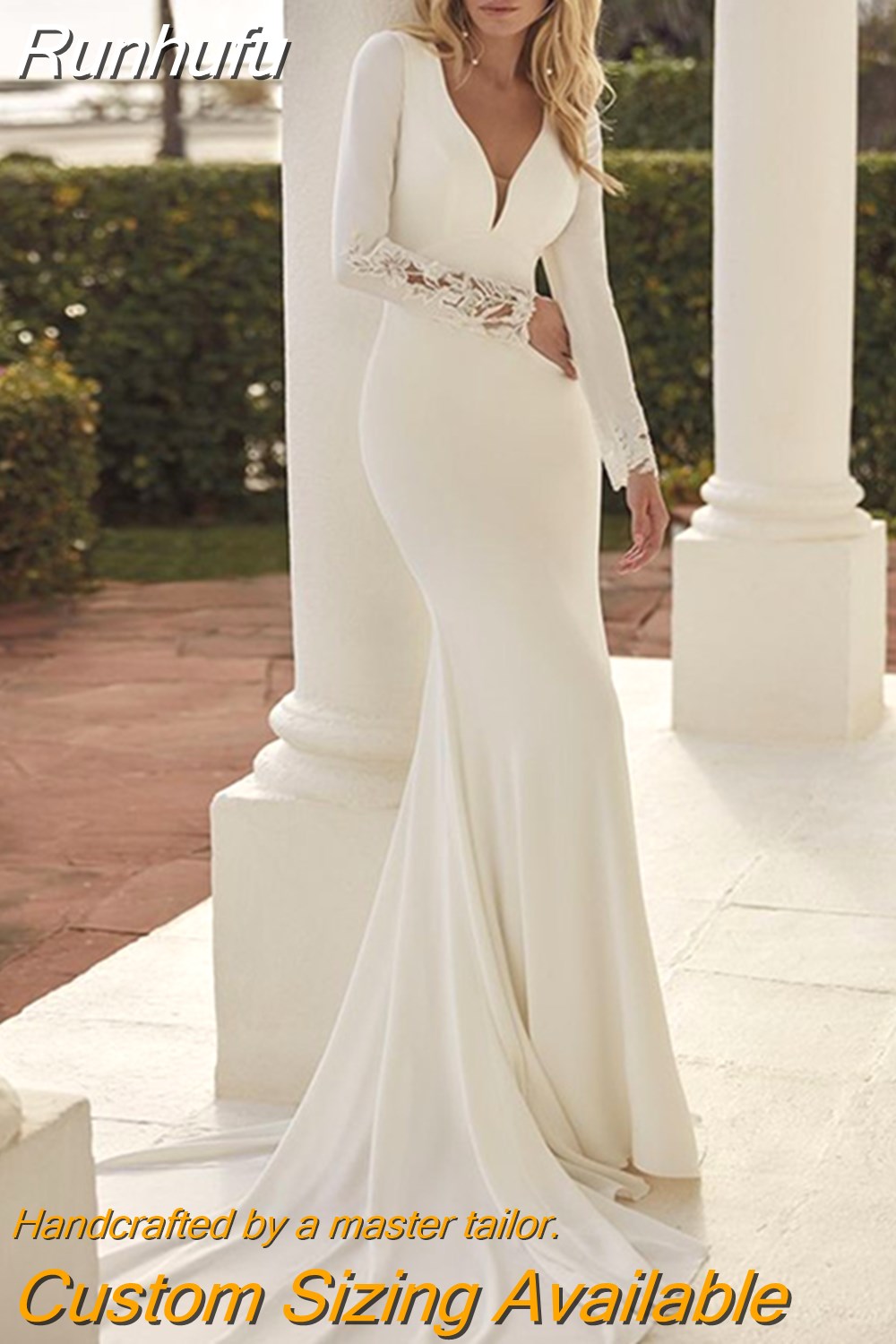Runhufu V-Neck Wedding Dress Long Sleeve Lace Appliques Backless Sexy Mermaid Bride Gown Zipper Button Train Vestido De Noiva