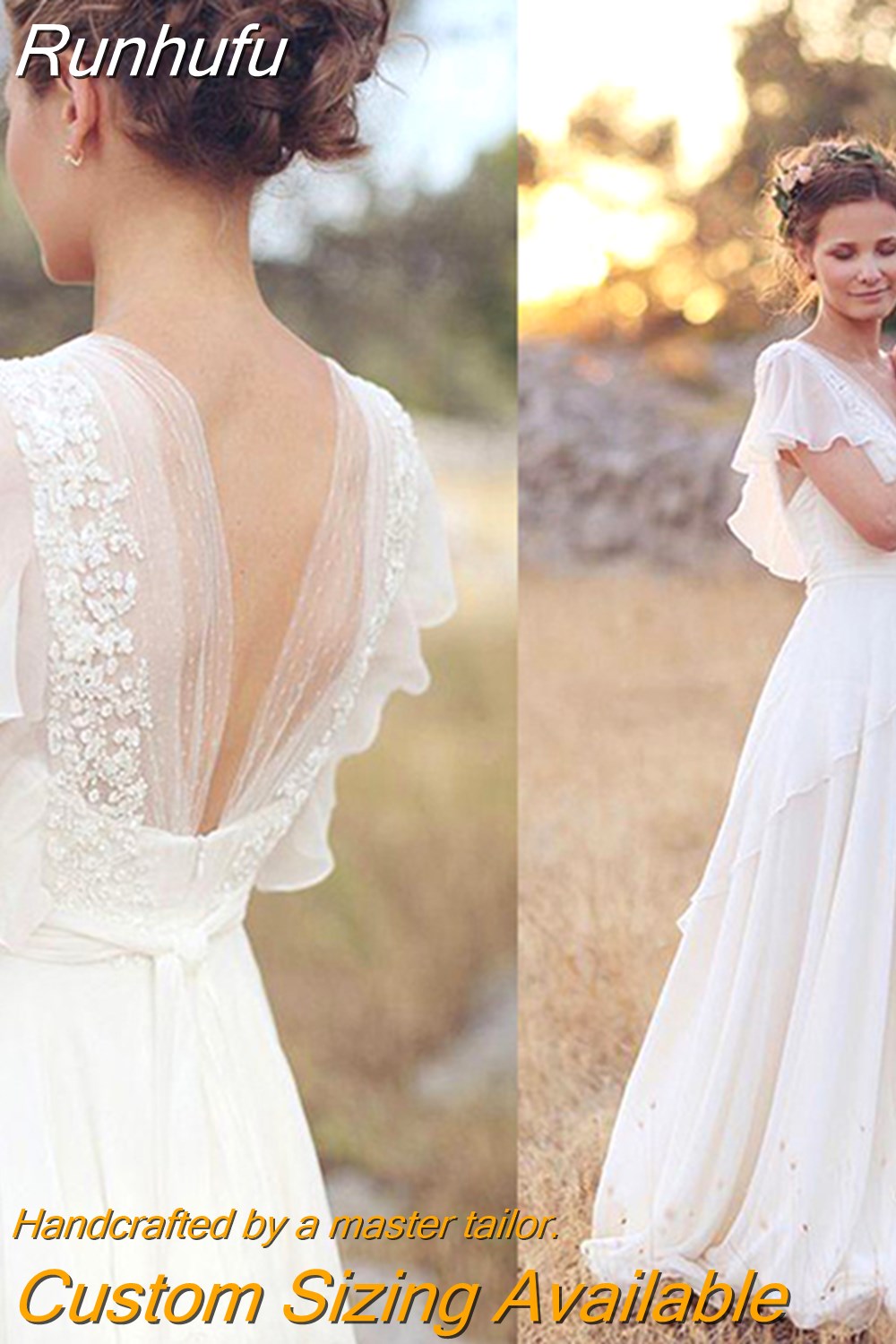 Runhufu V-Neck Wedding Dresses Chiffon A Line Short Sleeves Backless Floor Length Ruffles Beach Bridal Gowns Bohemian Simple Summer