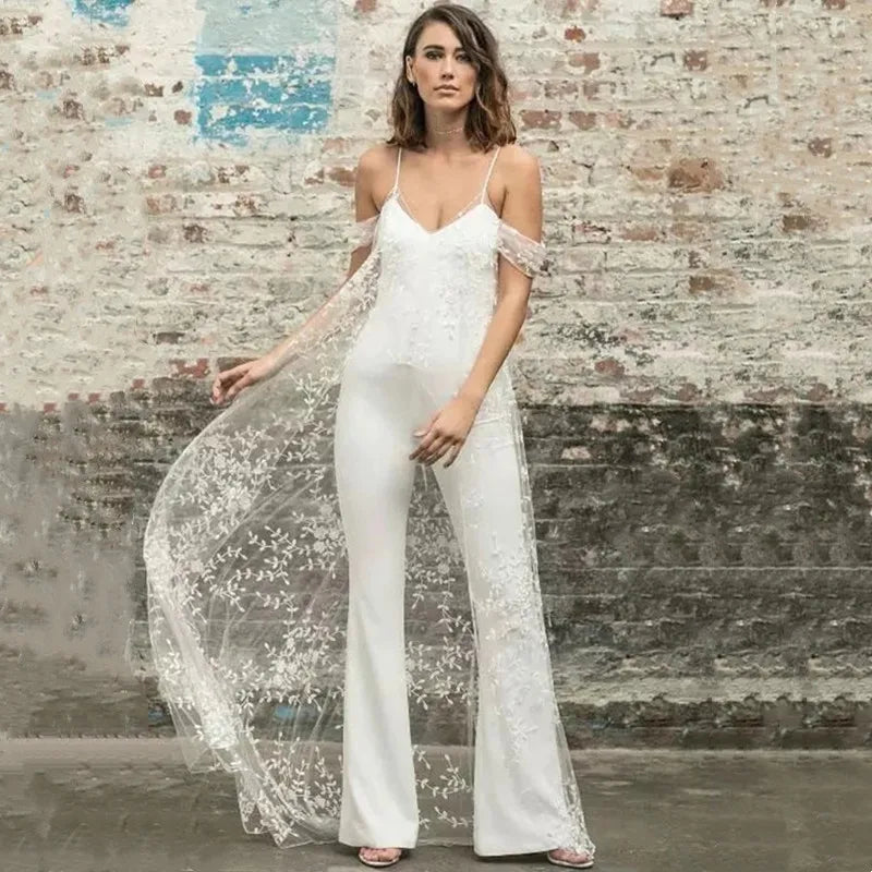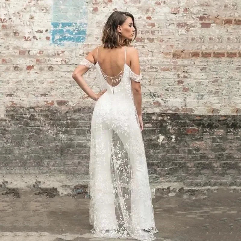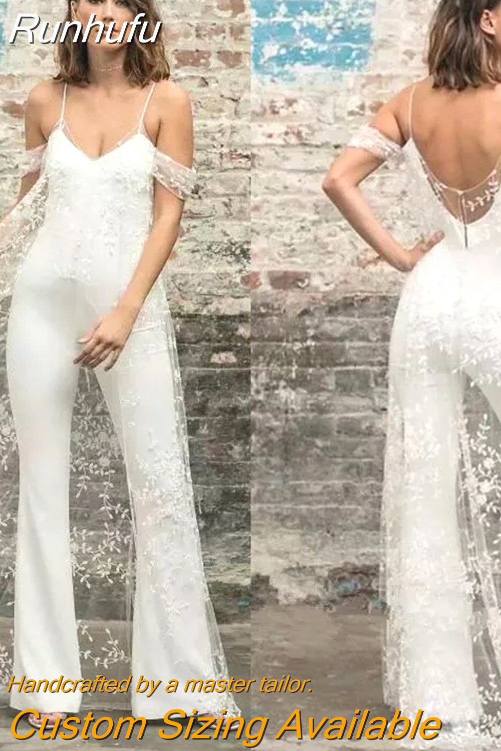 Runhufu V-Neck Wedding Jumpsuit Lace Applqiues Tulle Backless Pants Sets For Brides Zipper Off The Shoulder Vestidos De Novia
