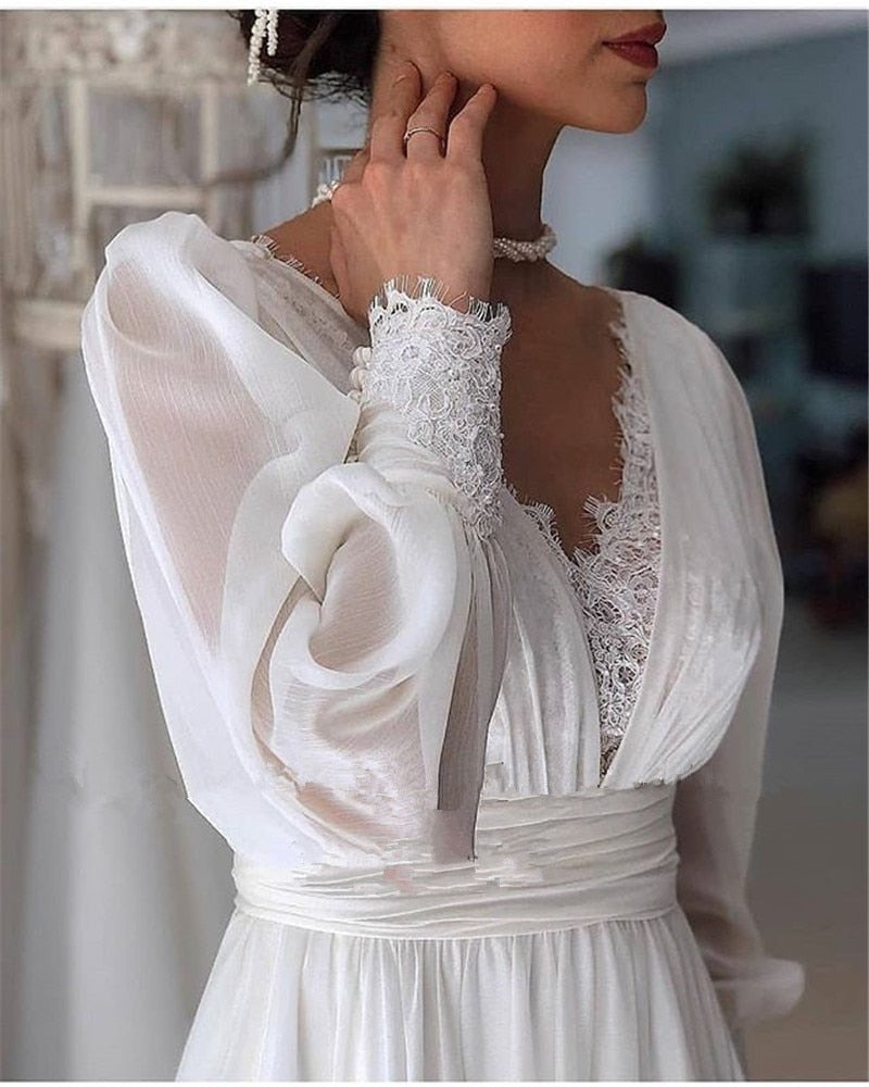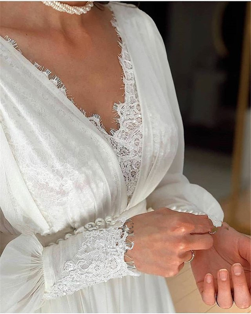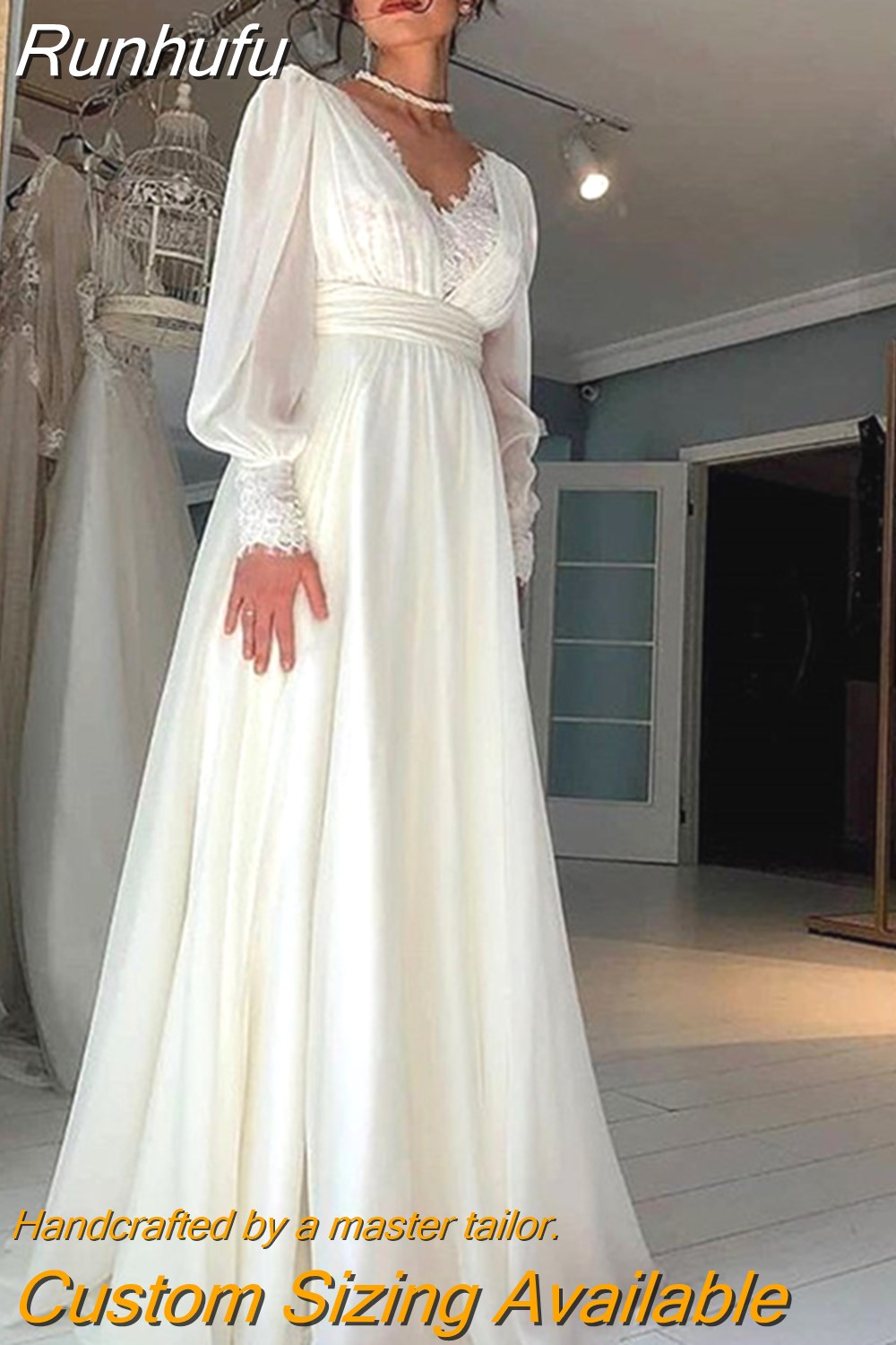 Runhufu Vintage Boho Lace Chiffon Wedding Dresses Puff Long Sleeves V Neck Bohemian Bride Gowns Floor Length Elegant Bridal Dress