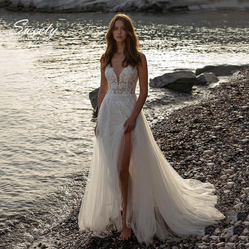 Runhufu Wedding Dress Organza With Embroidery Lace Backless Slit A Line Bride Dress V-neck Sexy Sleeveless Gowns Vestido De Novia
