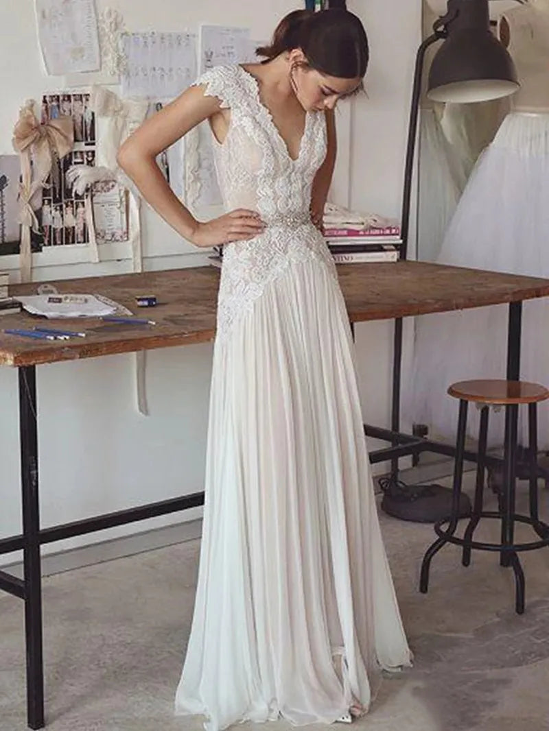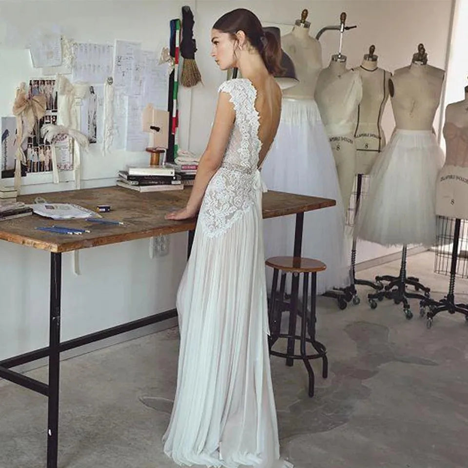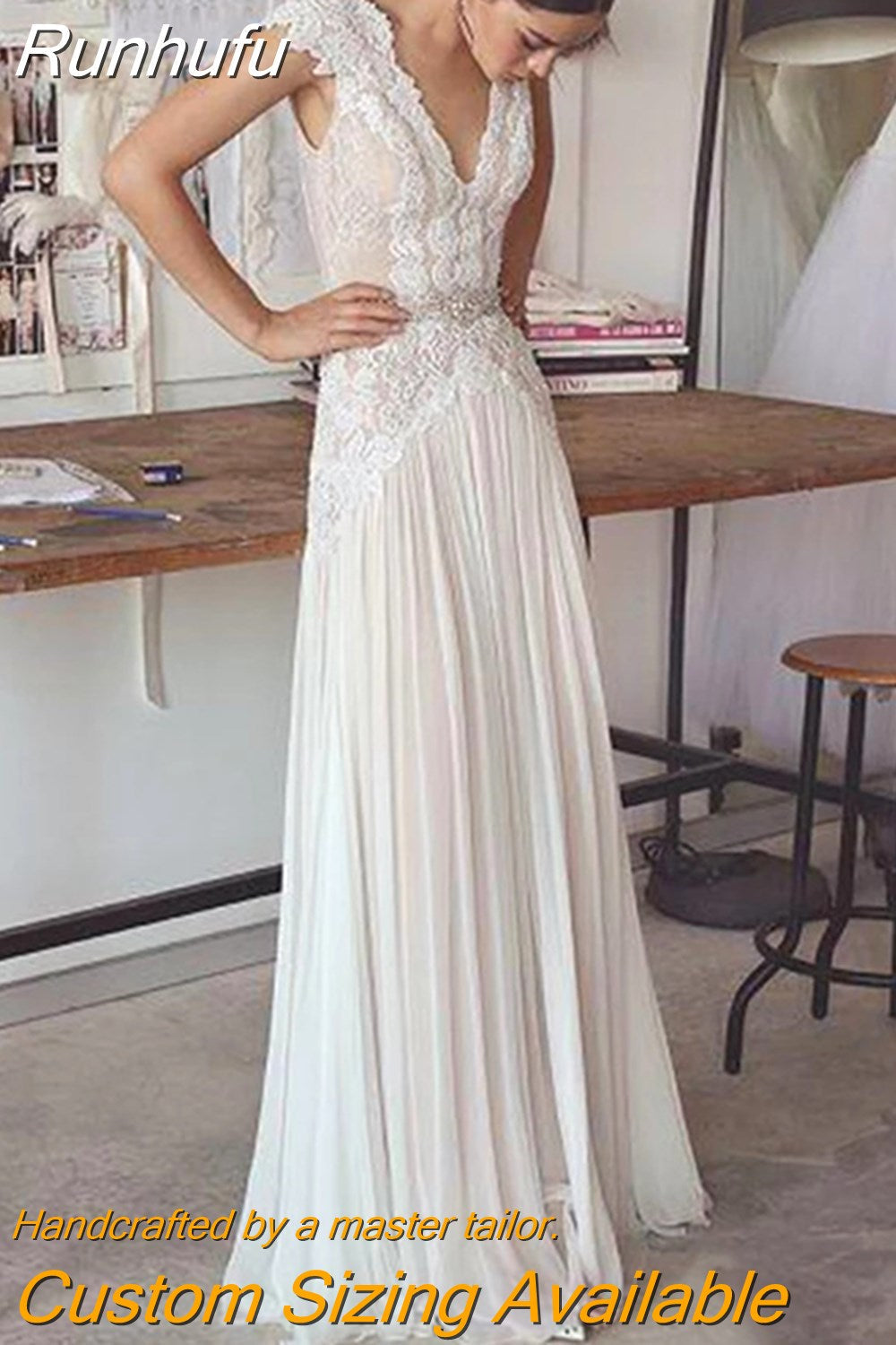 Runhufu Wedding Dresses 2023 Bohemian Wedding Gowns with Cap Sleeves V Neck Open Back Pleated Skirt Elegant A line Bridal Gowns