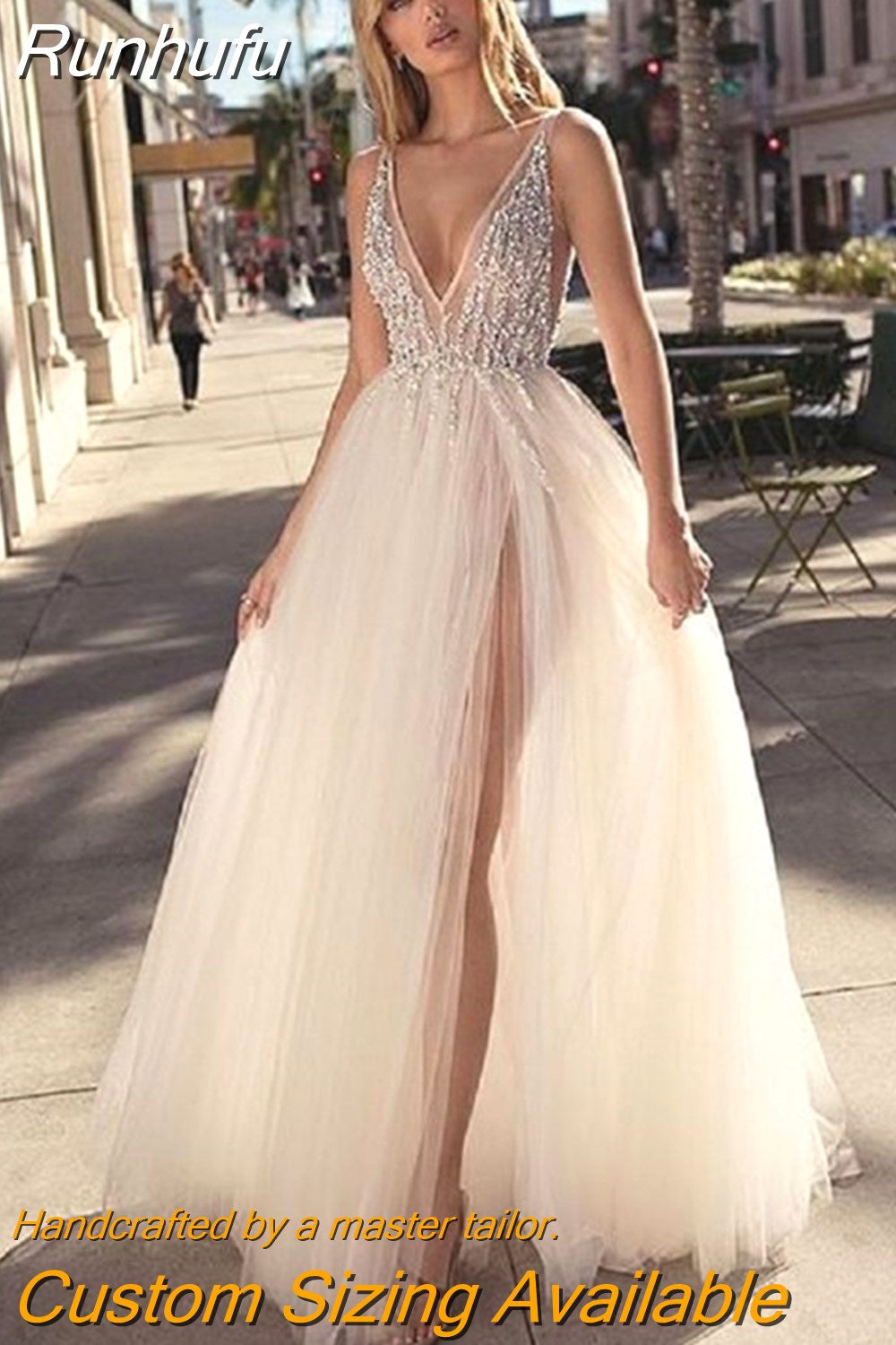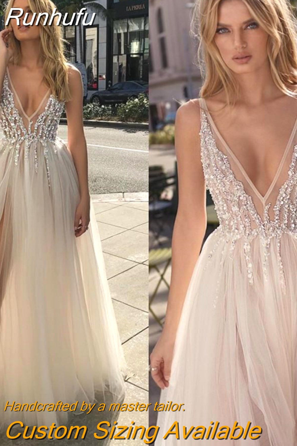 Runhufu Wedding Dresses 2023 Sexy Side Split Beaded Deep V Neck Backless Bohemian Bridal Gowns Floor Length Vestido De Novia