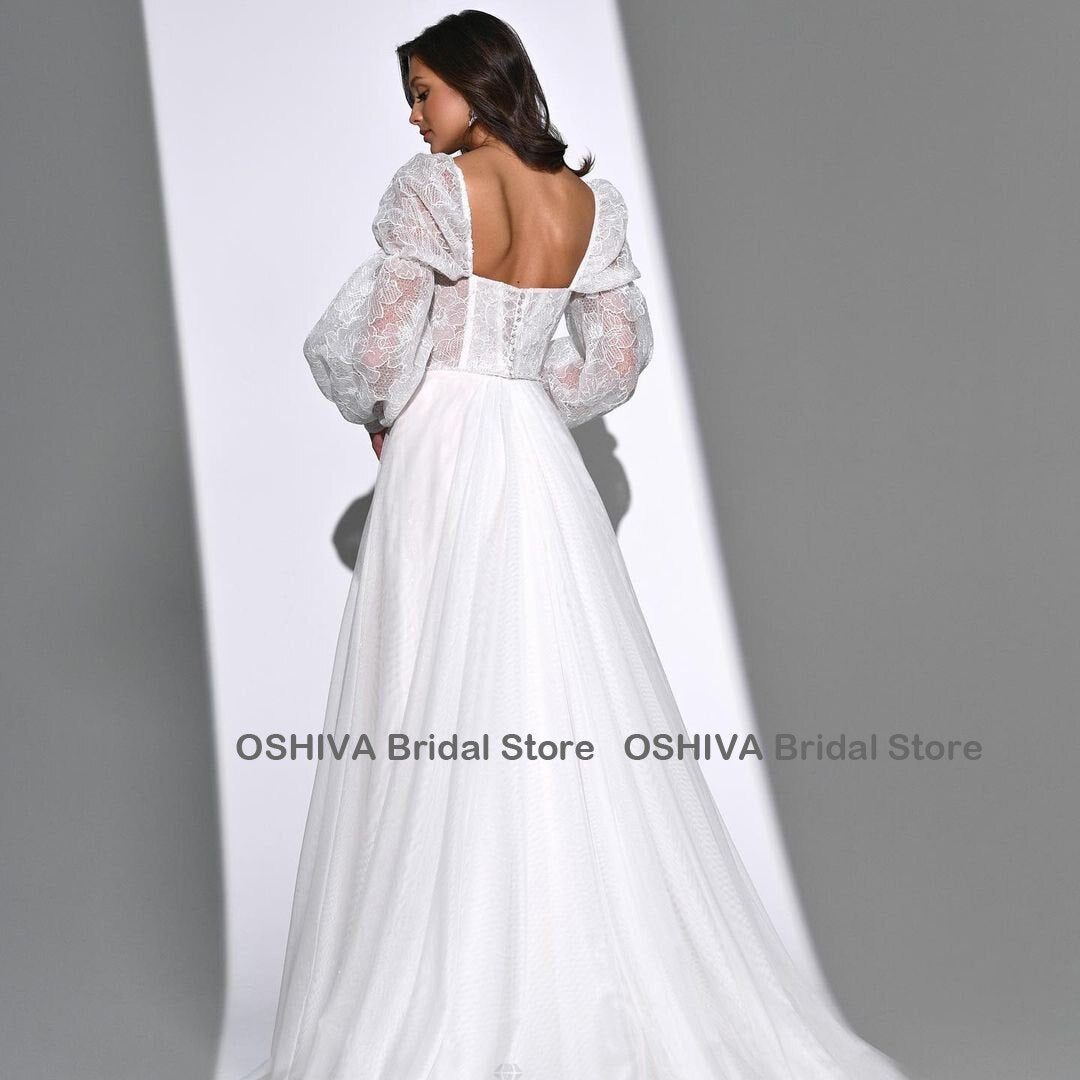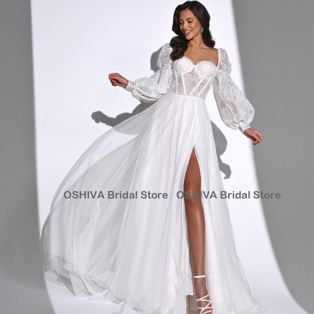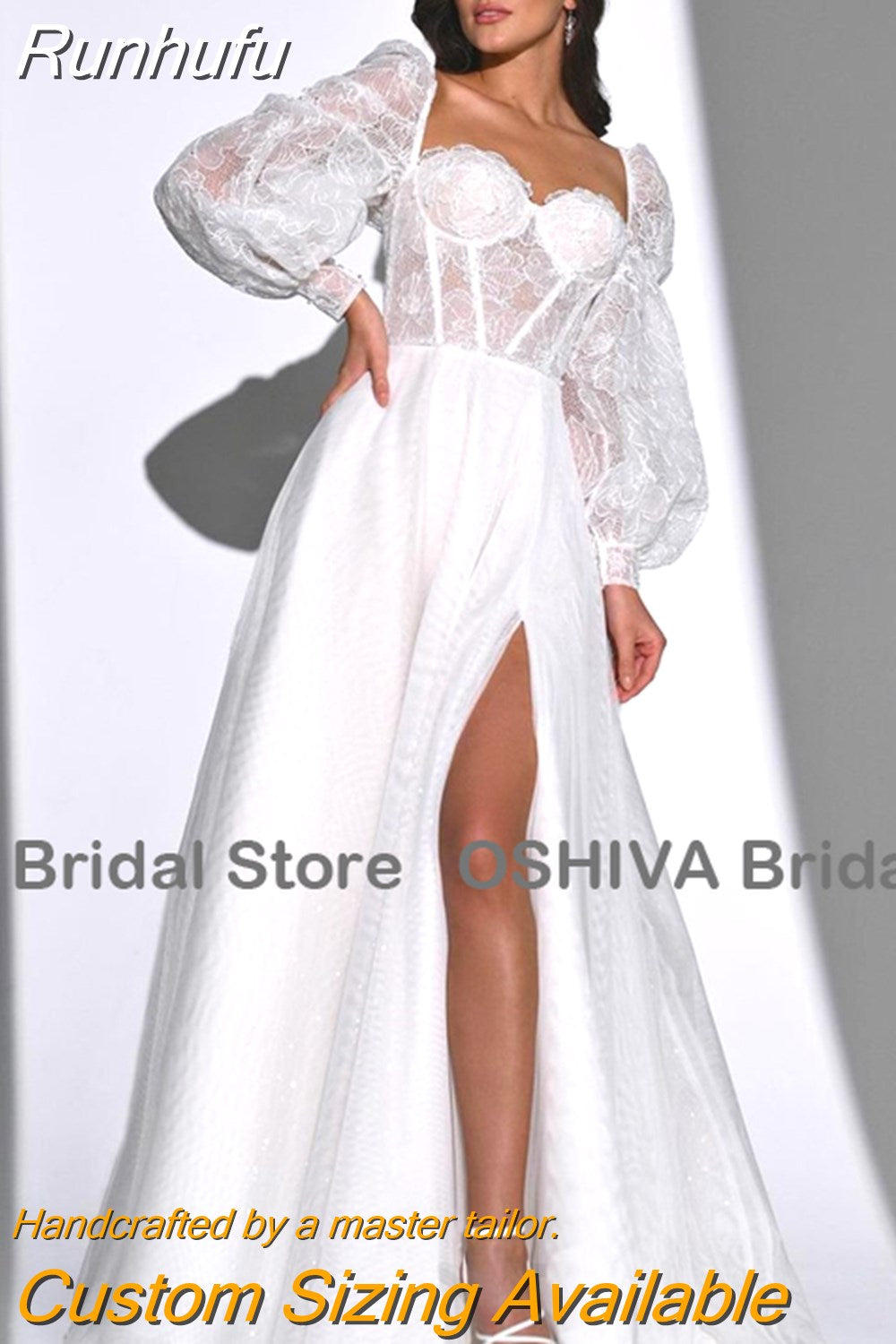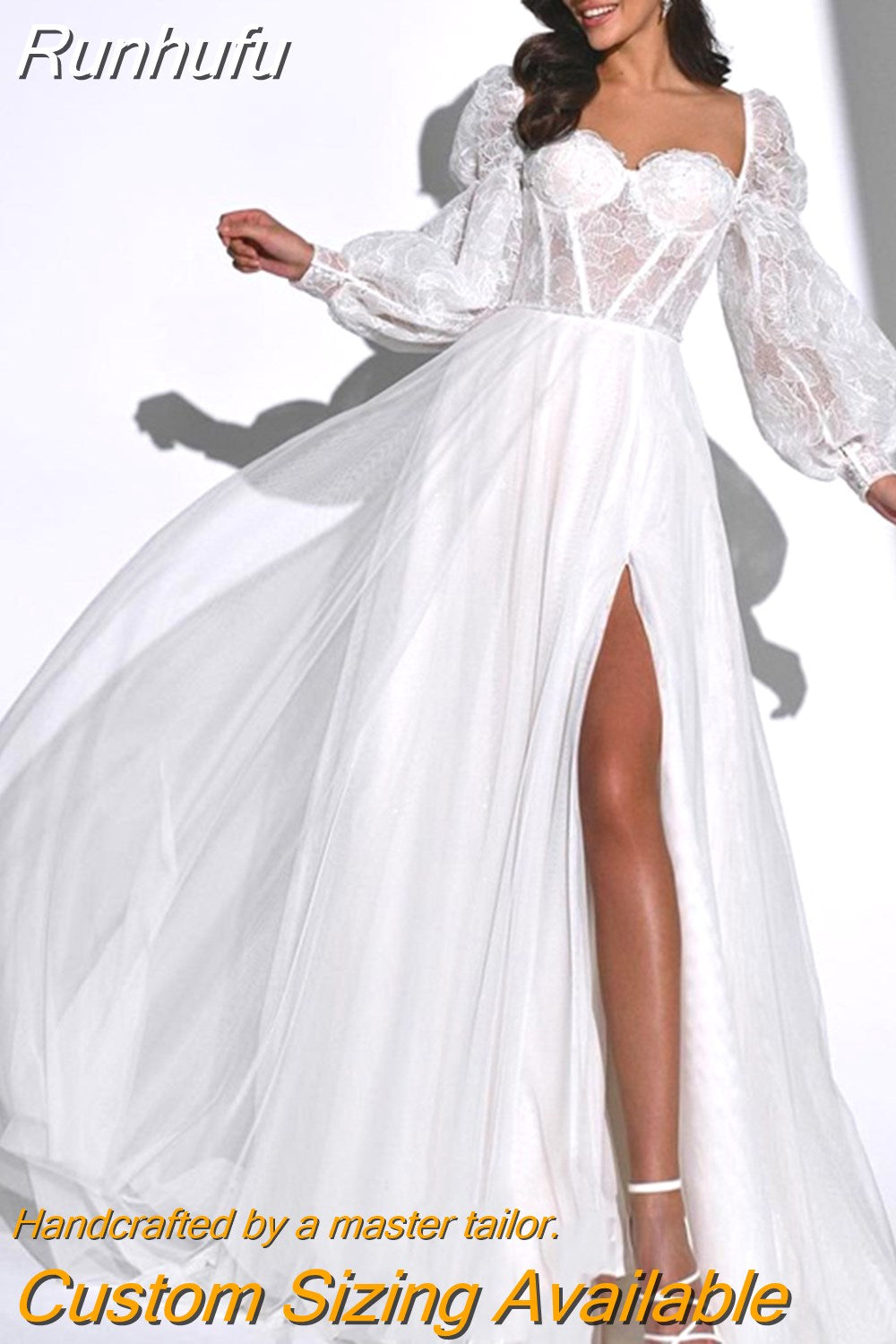 Runhufu Wedding Dresses Chic A Line Lace Puff Long Sleeve Long High Slit White Bridal Gown For Women Formal