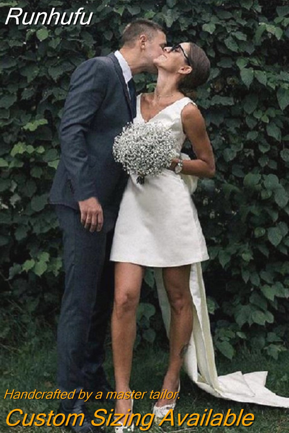 Runhufu White 2 IN 1 Wedding Dresses Boho Large Bow V Neck Robe De Mariee Short Bridal Gown with Long Detachable Skirt For Bride