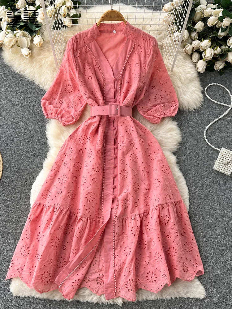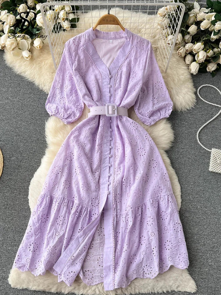 Runhufu Women Cotton Beach Long Dress Short Sleeves Sashes Retro Design Sundress High Quality Embroidery Mermaid Maxi Dress