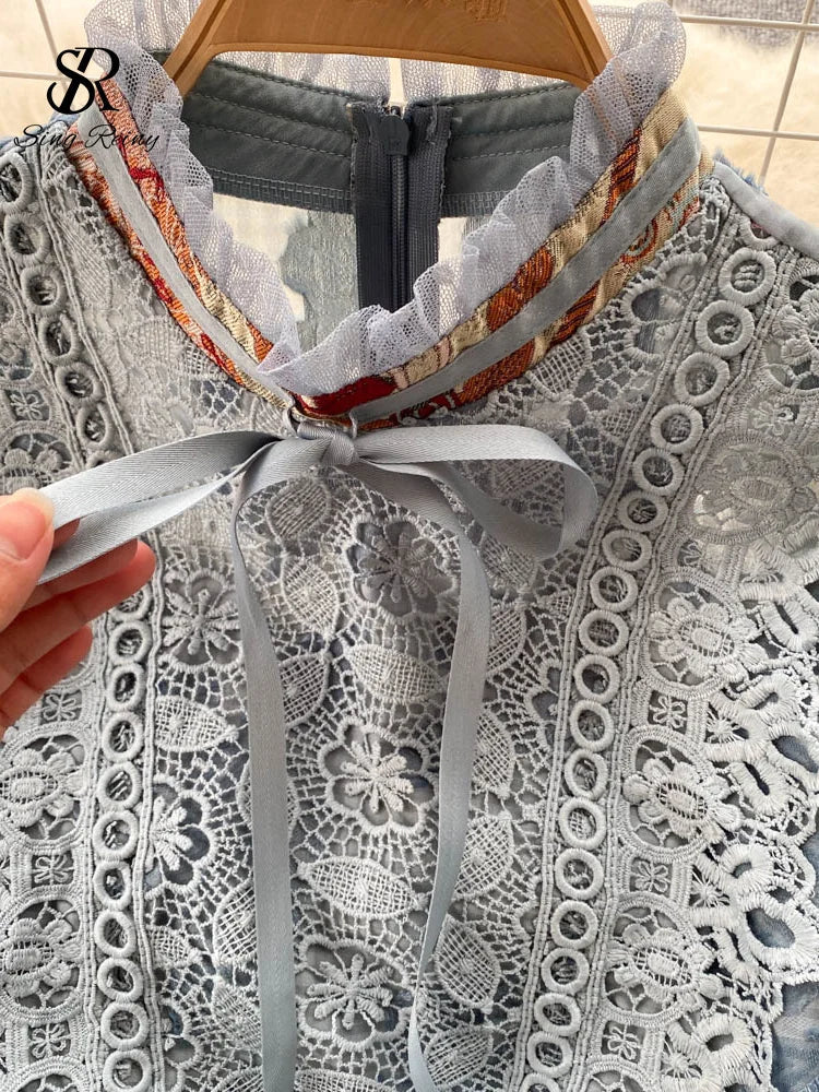 Runhufu Women Embroidery French Style Dress Summer 2024 Lace Splice Elegant Bow Neck Long Sleeves Ladies A Line Midi Dresses