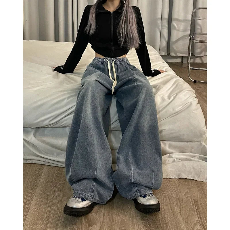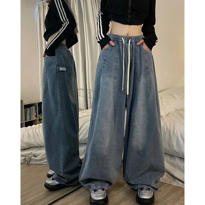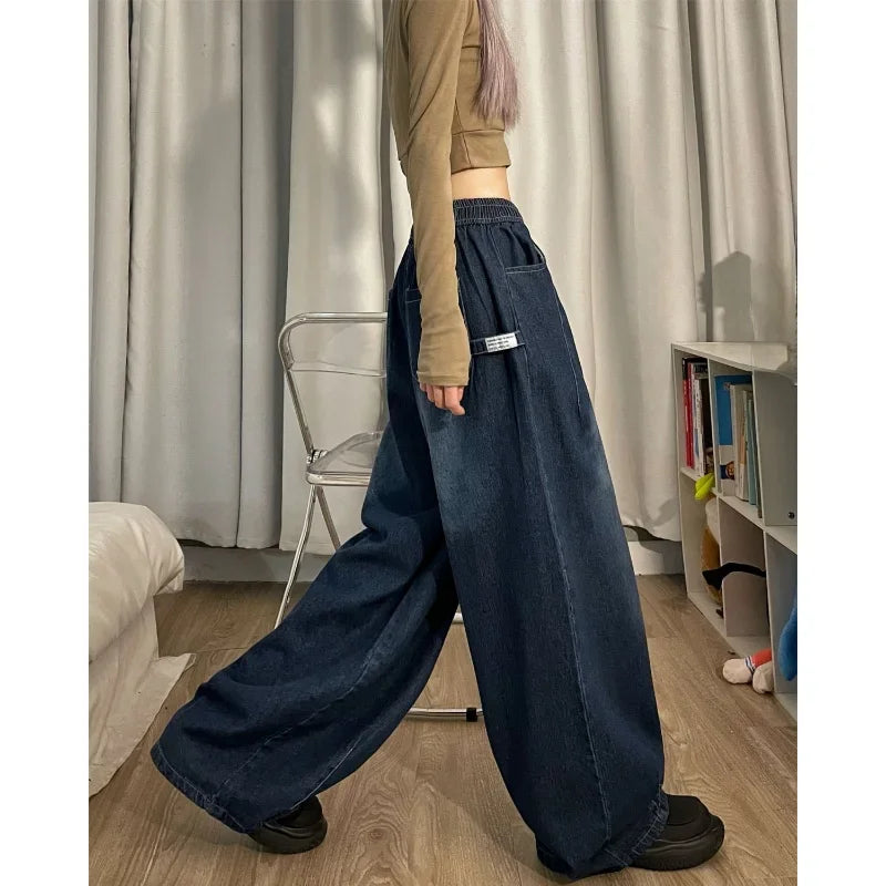 Runhufu Women Vintage Baggy Jeans Elastic Waist Oversized American Trouser Denim Wide Leg Streetwear Straight Basic Pants Y2k