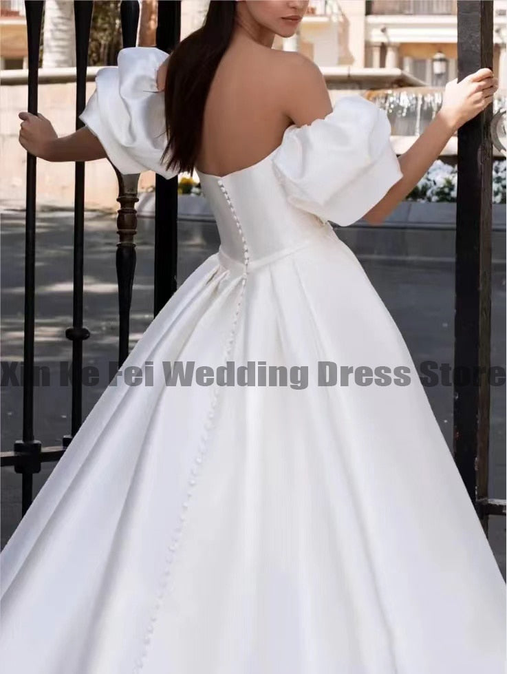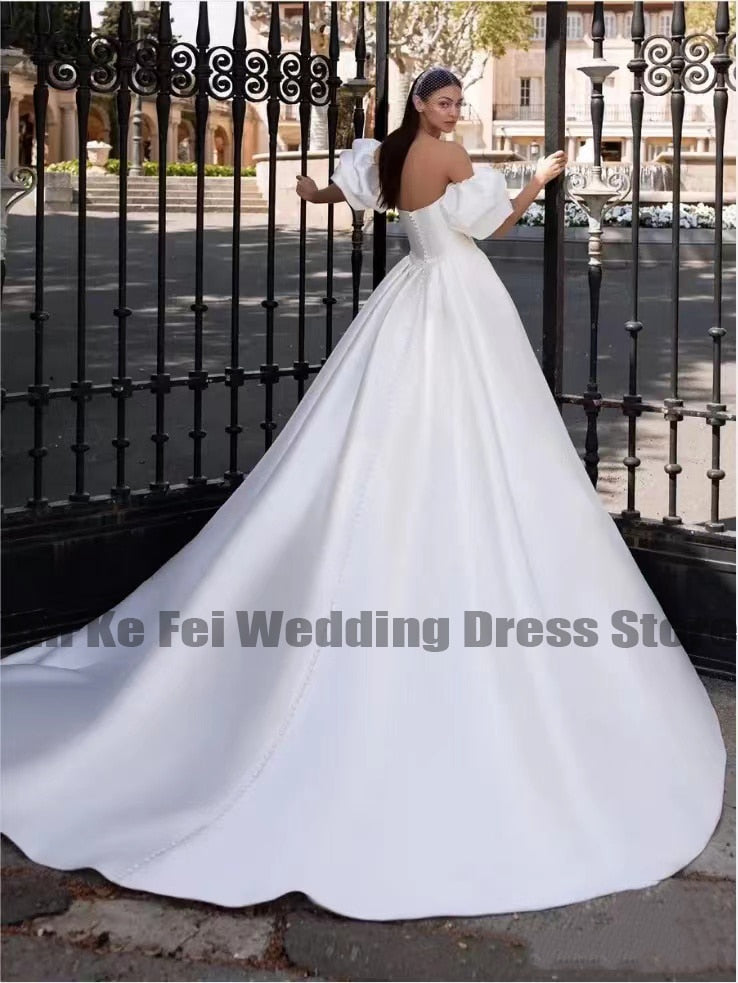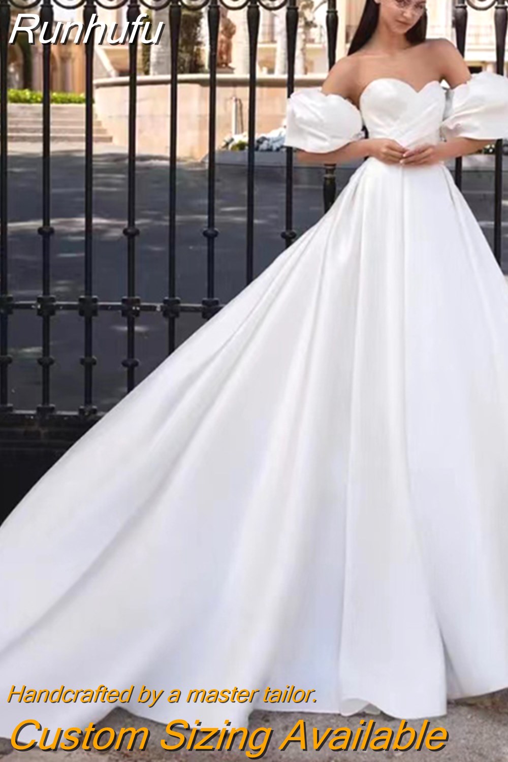 Runhufu Women's Bridal Dresses Satin Pleated Sexy Off Shoulder Bubble Sleeve Removable Princess Prom Wedding Welcome Guest Gowns