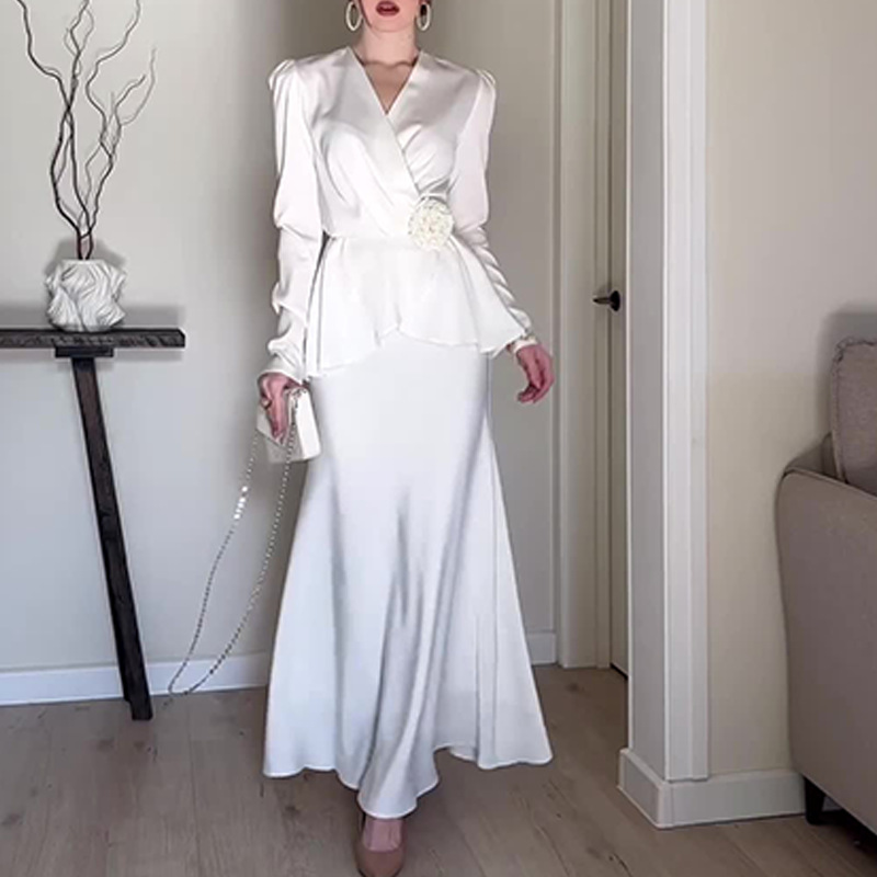 runhufu Women's Dress French V-Neck Temperament Suit Skirt High-Waisted Tie With Flowers High-Rise Half-Dress Two