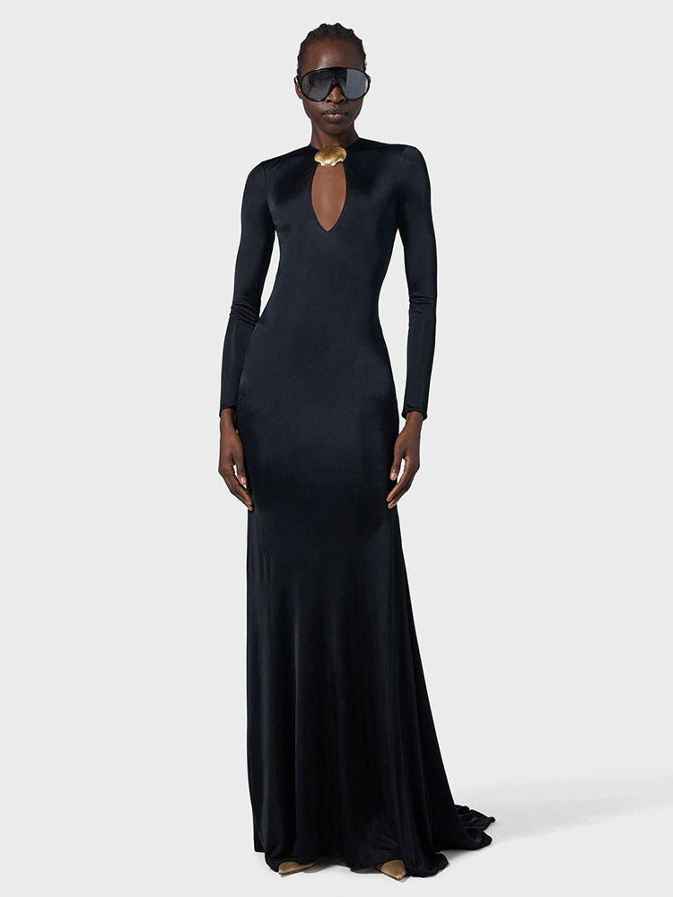runhufu Women's Sexy V-Necked Long-Sleeved Banquet Evening Dress Dress Body-Dragging Skirt