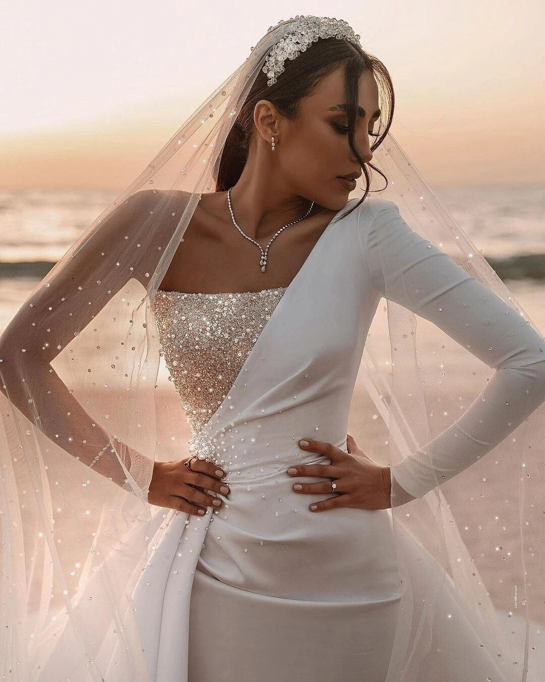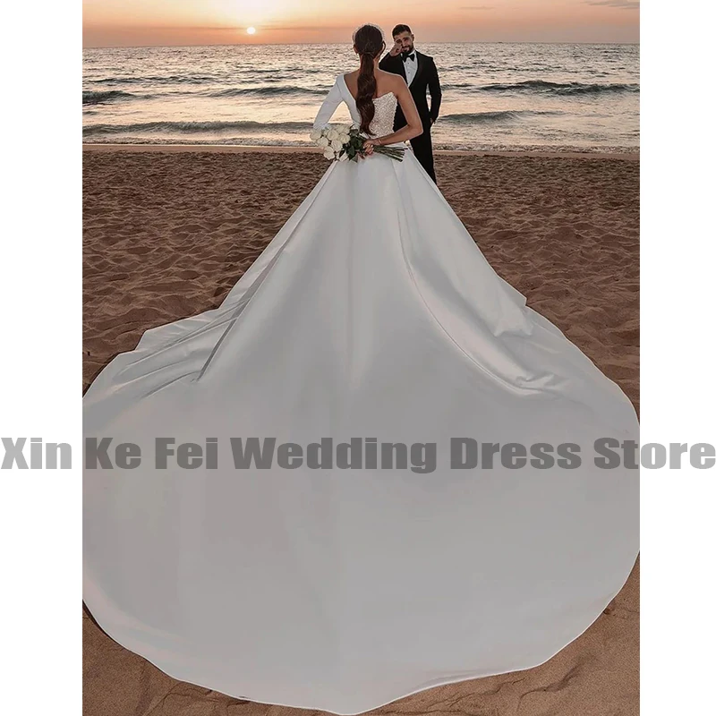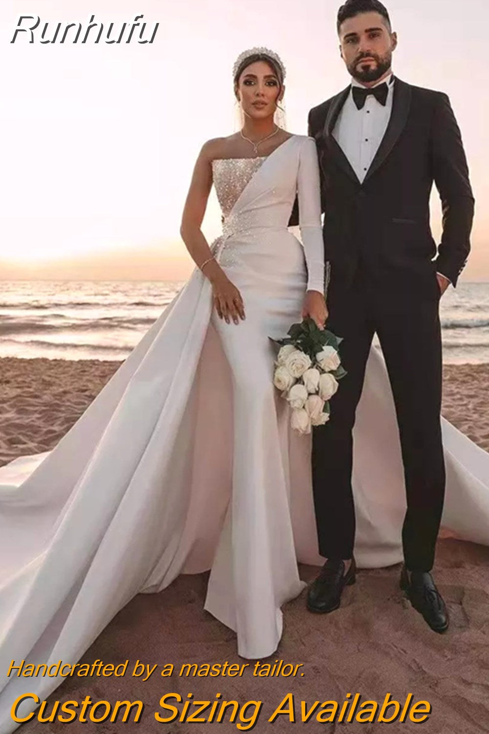 Runhufu Women's Wedding Dresses Satin Pleated Glittering Sequin Mermaid Pleated Bridal Gowns Robe Vestidos De Novia свадебное
