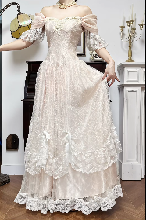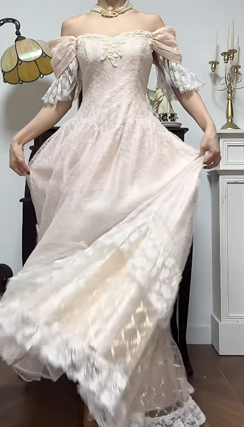 Sweet Light Champagne Off-the-shoulder A-Line Princess Prom Dresses Chiffon Lace Vintage Wedding Dress HZ1108