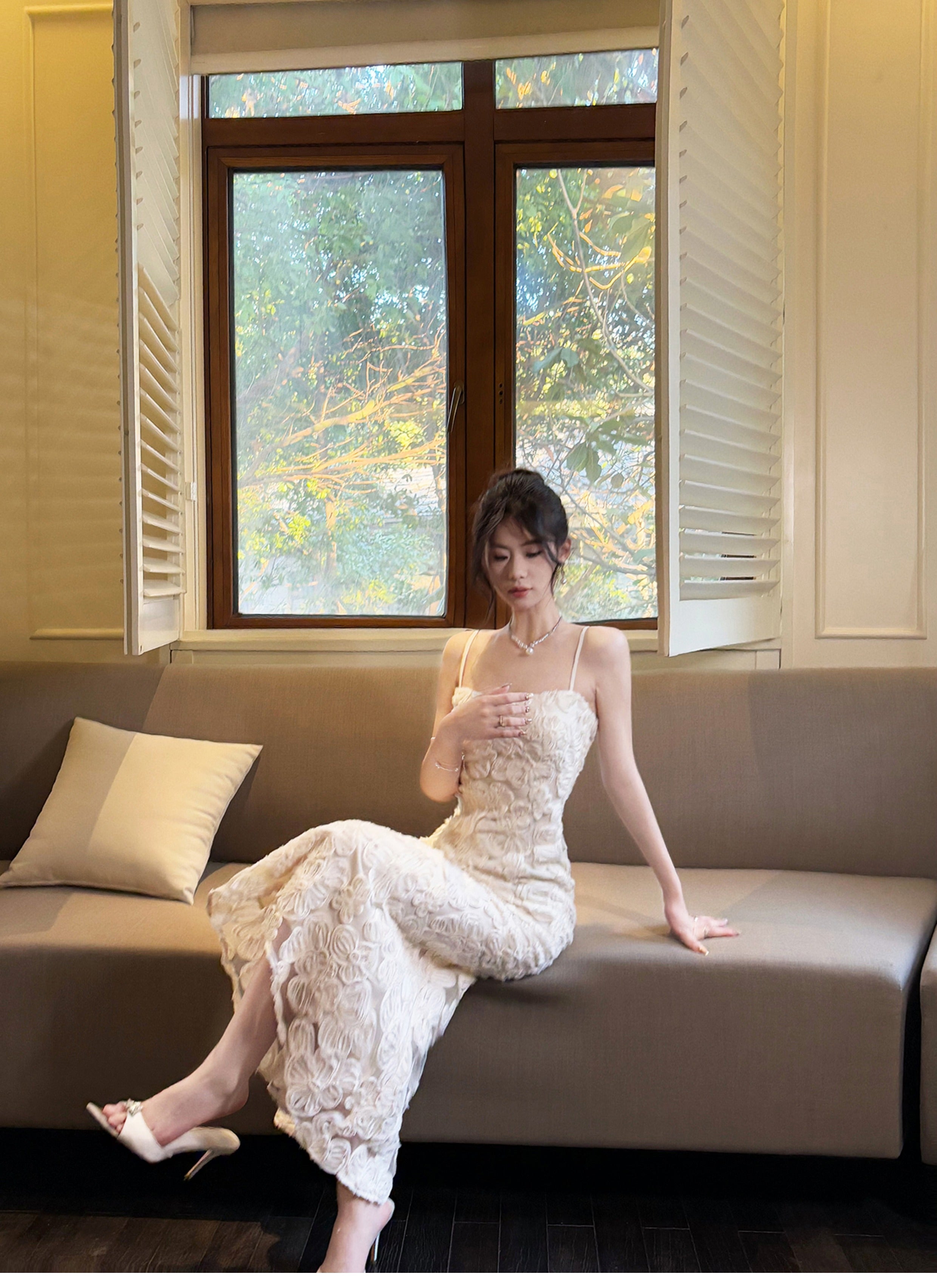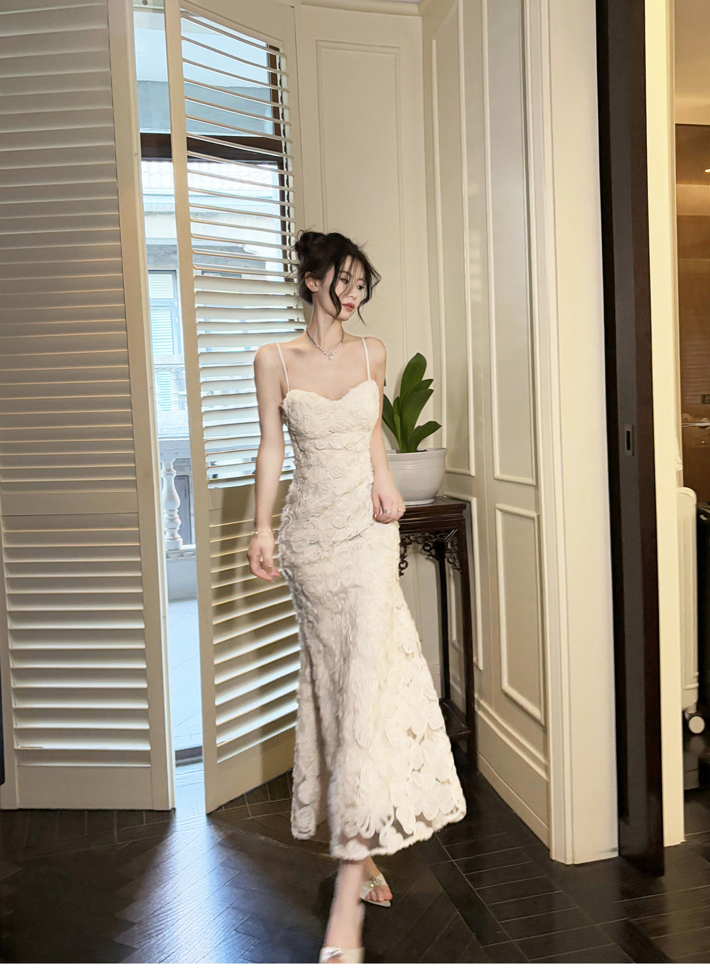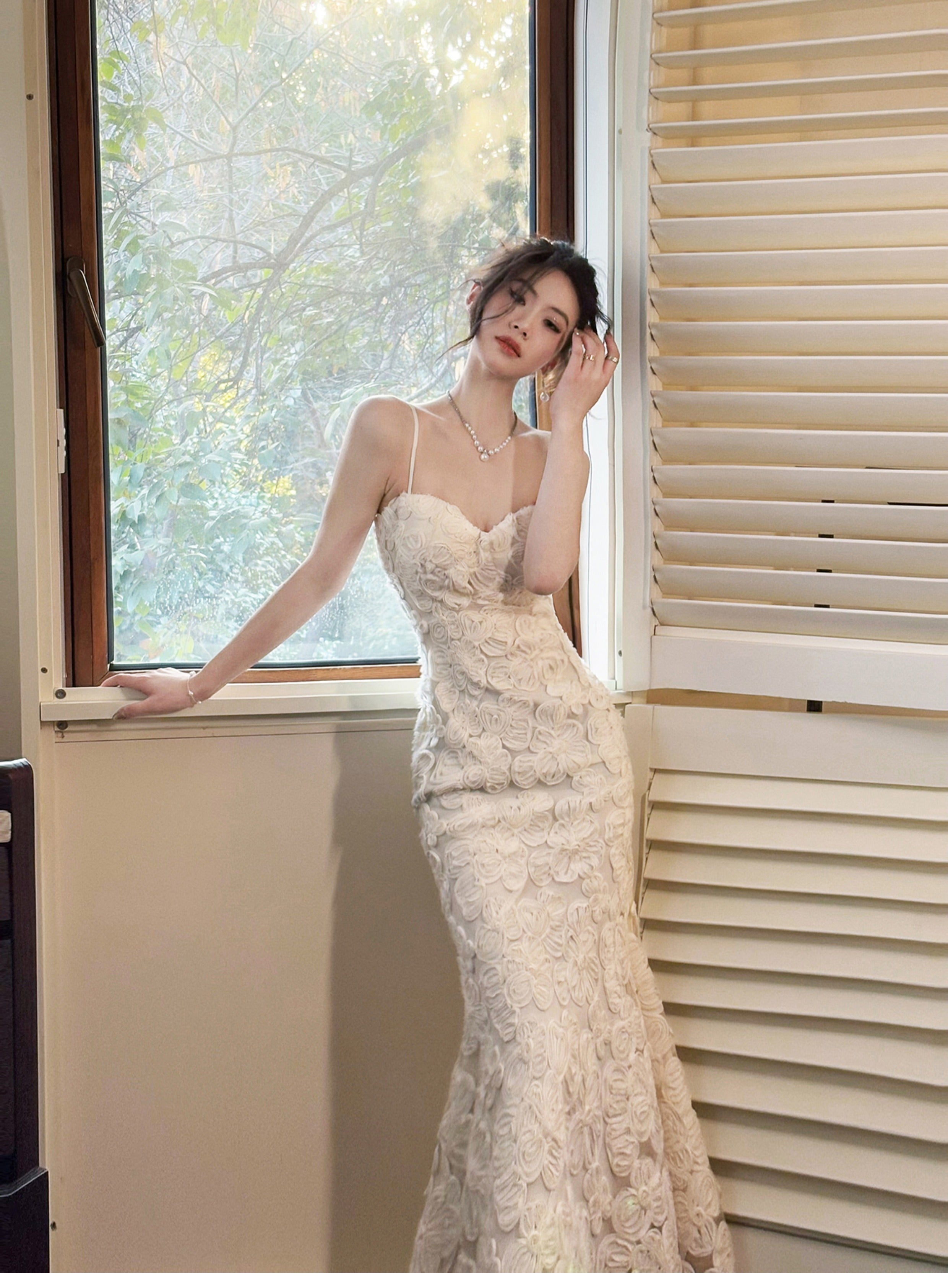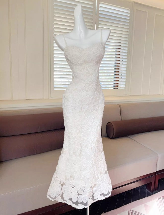 White Elegant 3D Flower Embroidery Spaghetti Straps Mermaid Birthday Party Dress HZ1108